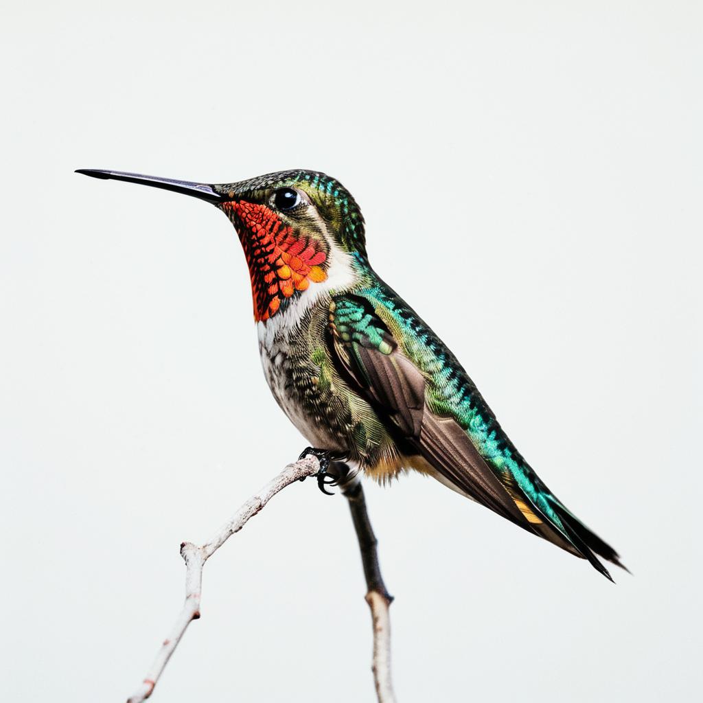 A full-body, side-view shot of a hummingbird, on a white background, cinematic lighting, natural kodak-film tone, hyper-realistic details, vibrant and beautifully color-coded
