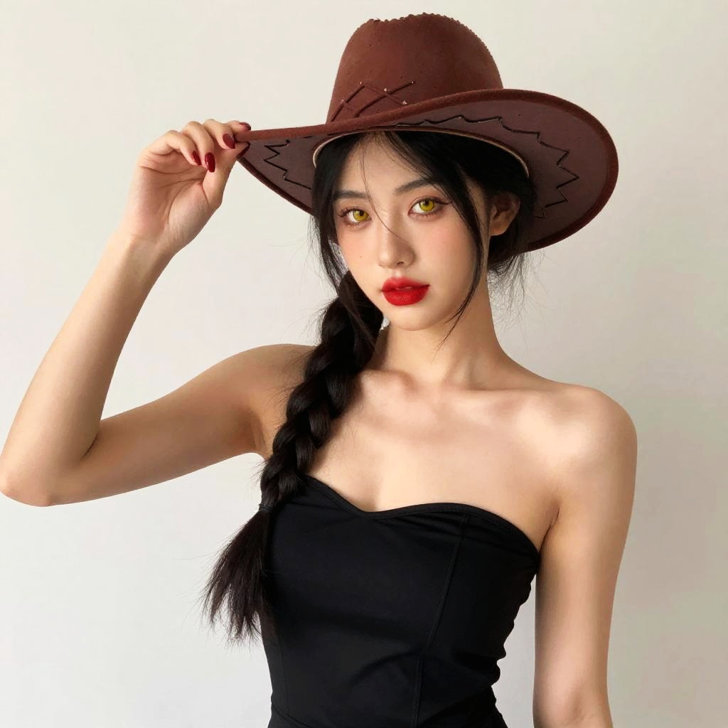 Digital artwork of an Asian woman with long black hair in a braid, wearing a brown cowboy hat and strapless black top, against a white background