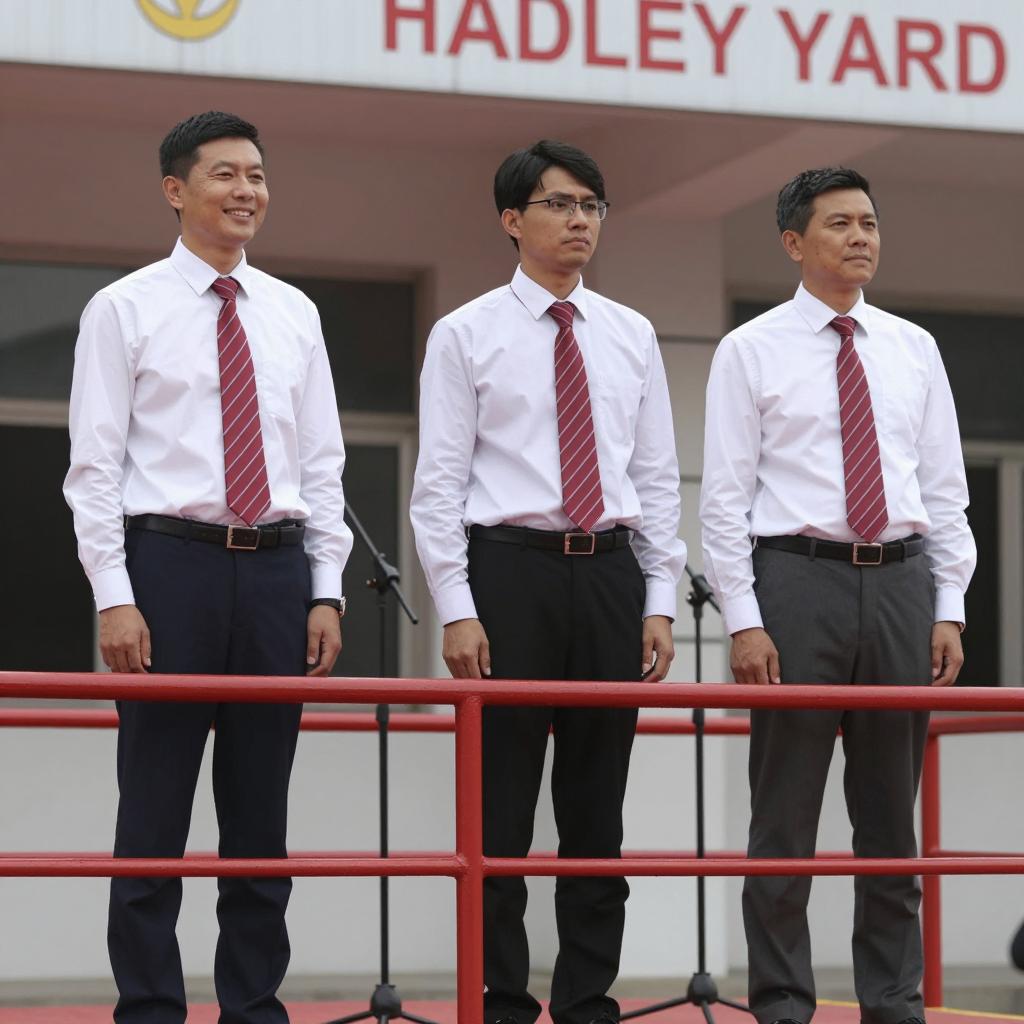Three men standing on a raised platform with a red railing. All wear white dress shirts, red striped ties, and dress pants. The man on the left has short black hair and smiles, the man in the middle wears glasses and looks forward, the man on the right has short dark hair and looks to the right. Background has a building with "HADLEY YARD" sign. Microphone stands between the men.