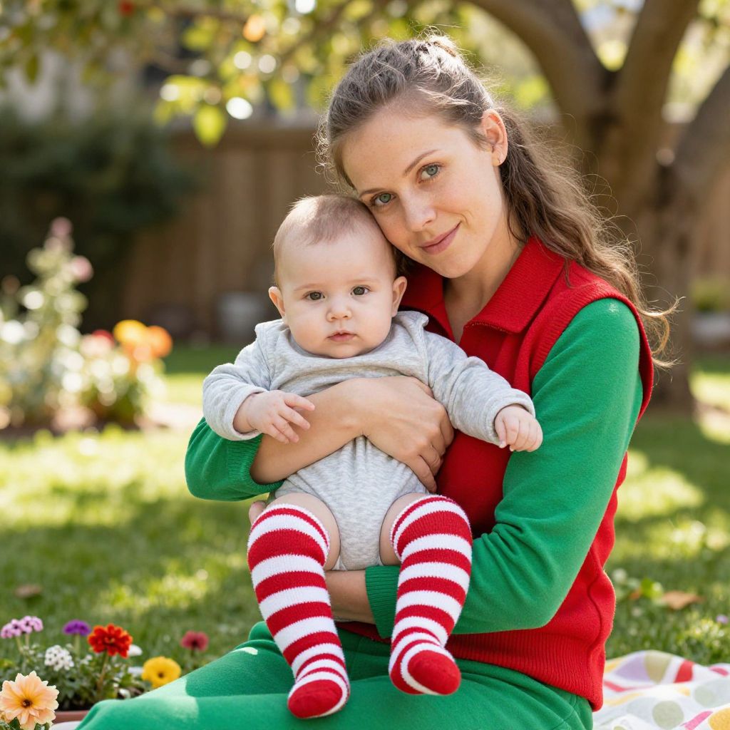 A kind and warm-hearted mother in a vibrant green and red outfit, wearing cozy red and white striped socks, gently holds a baby in her arms with a soft, tender expression. She has warm, friendly eyes that radiate love and compassion, and a gentle smile that reflects her calm and nurturing presence. The scene takes place in a sunny backyard filled with soft green grass, blooming flowers in full color, and dappled sunlight filtering through the trees. The atmosphere is warm, inviting, and peaceful, capturing a moment of deep tenderness and connection between parent and child, evoking feelings of comfort, safety, and joyful family moments.