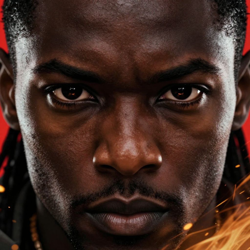 Close-up photograph of a serious, intense-looking Black man with dark skin, short dreadlocks, and piercing eyes against a red background.