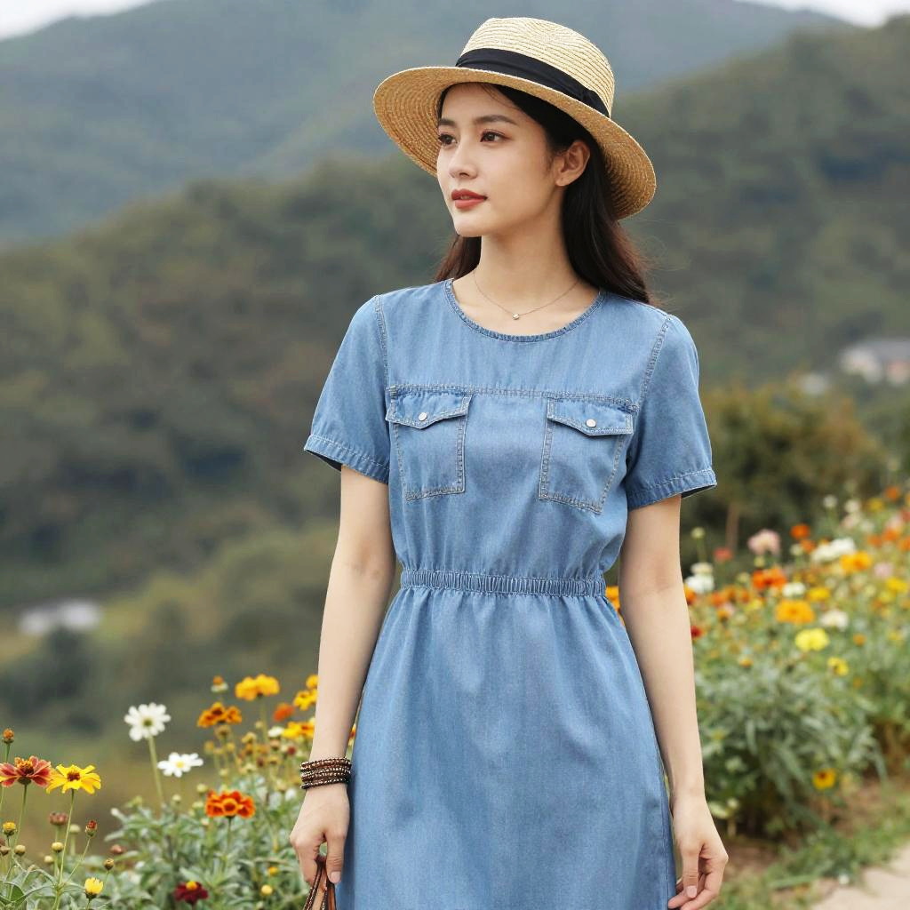 A woman in a casual chic light blue denim t-shirt dress with short sleeves and two front pockets, accessorized with a thin necklace, stacked bracelets, and a straw fedora with a black ribbon, stands by a scenic overlook in a flower garden, captured in a studio pierrot visual style. Sexy. Pretty face and beutiful eyes