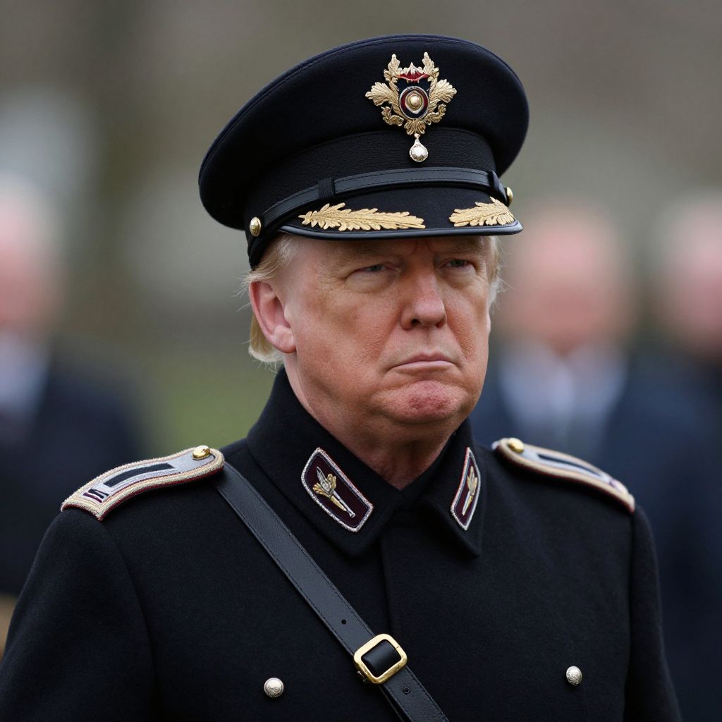 4k hd, high detail telephoto photograph, shallow depth of field : subject= donald trump + subject detail= wearing german wwii black outfit and wwii german officer cap