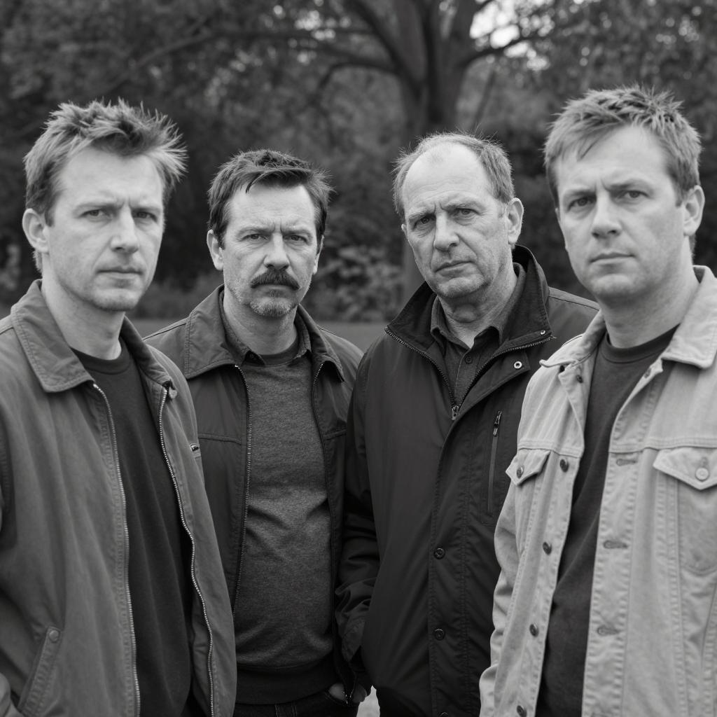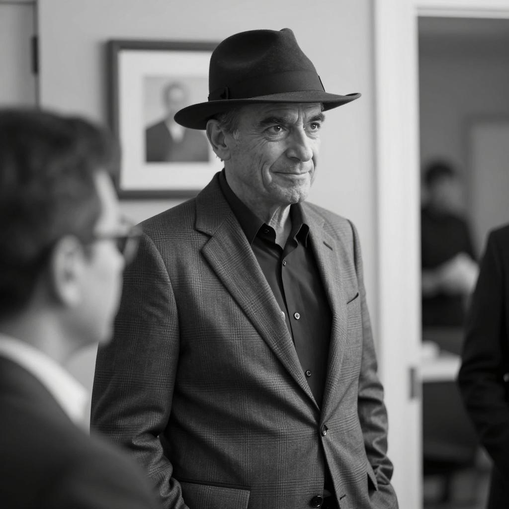 Black and white photograph of four men in a bar. Central man with short dark hair, expressive face, and wool coat leans on the counter. Older man with a fedora and bowtie on the right, smiling. Two men in the background wear hats. Plaid shirt on the left. Glass and ashtray on the counter. Background includes blurred bar elements and antlers.