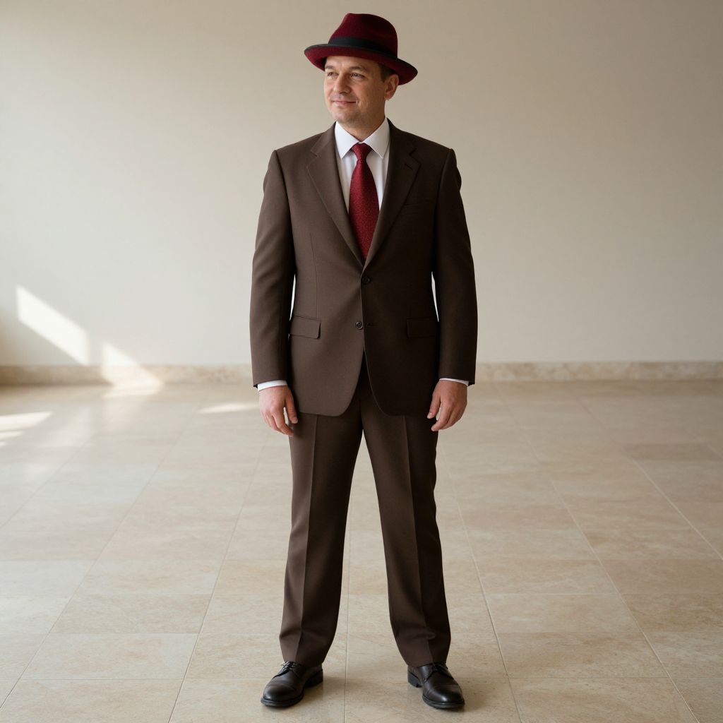 A man in a brown suit with a red tie and a red fedora hat stands confidently on a clean, polished tiled floor, the sunlight streaming through the window behind him, casting soft shadows and highlighting the details of his attire and the texture of the stone tiles. He has a friendly, thoughtful expression, with a slight smile, and his hands are relaxed at his sides, giving off a calm and composed atmosphere.
