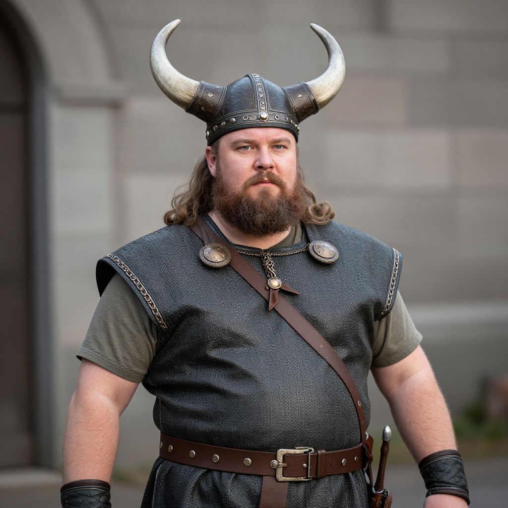 Photograph of a bearded man with long brown hair, wearing a Viking helmet with horns, dark tunic, and brown belt, standing in front