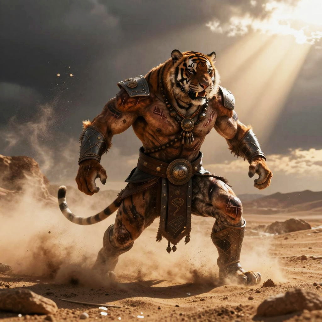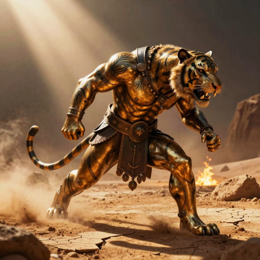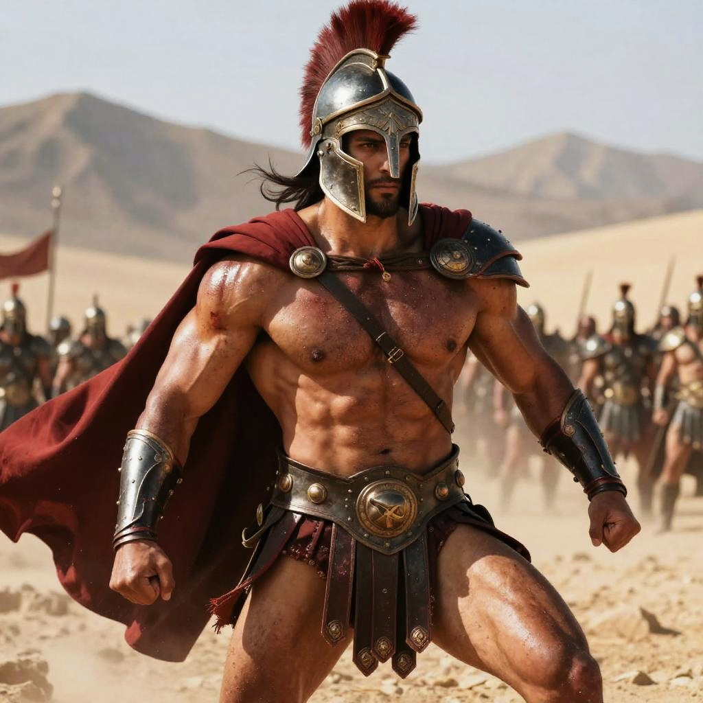 Digital artwork of a muscular, dark-skinned warrior with a bird helmet, wearing ornate bronze armor and skirt, standing in a sunlit, sandy