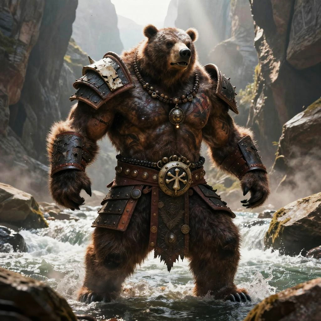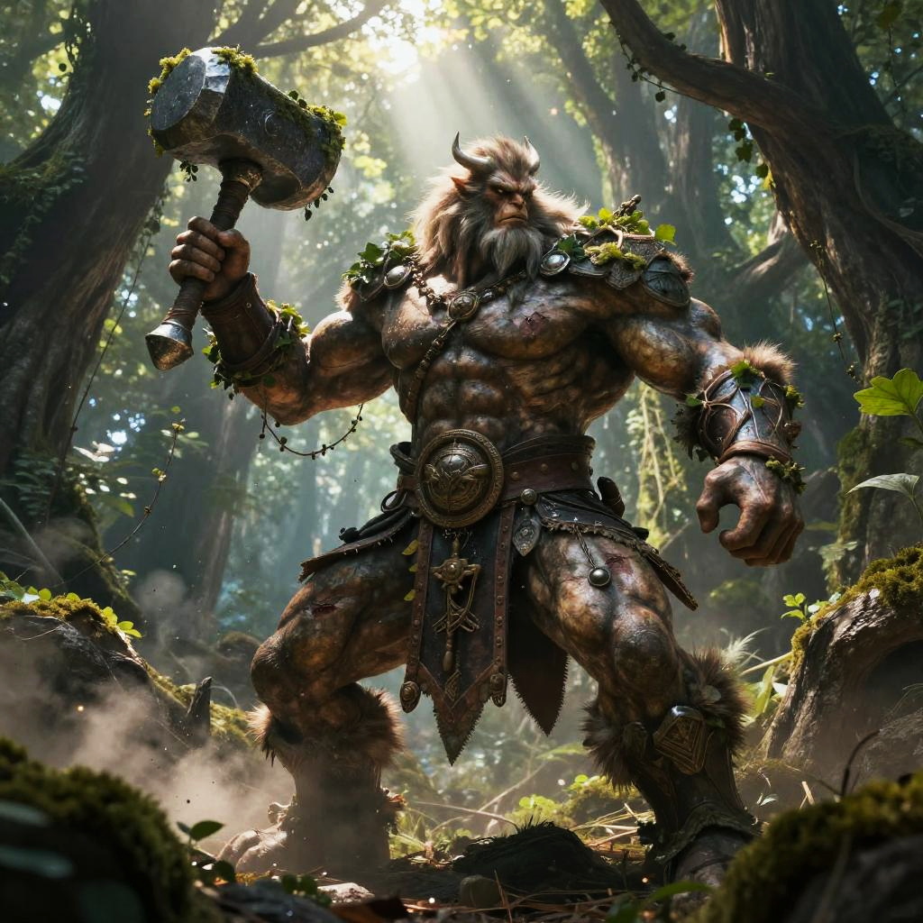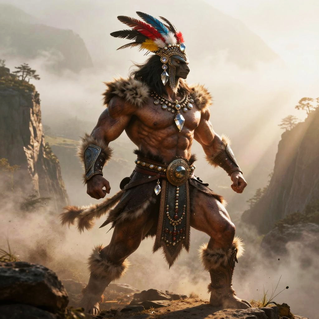 Digital artwork of a muscular, dark-skinned warrior with a bird helmet, wearing ornate bronze armor and skirt, standing in a sunlit, sandy