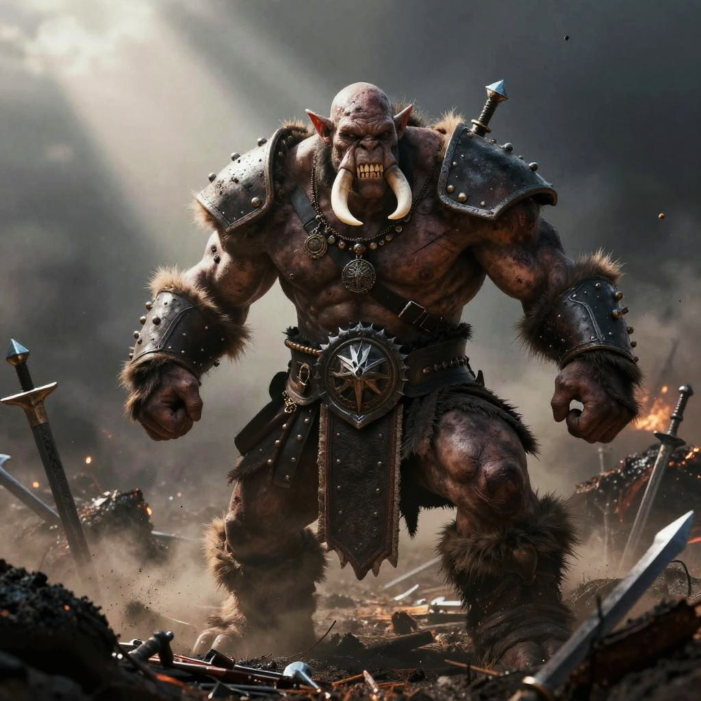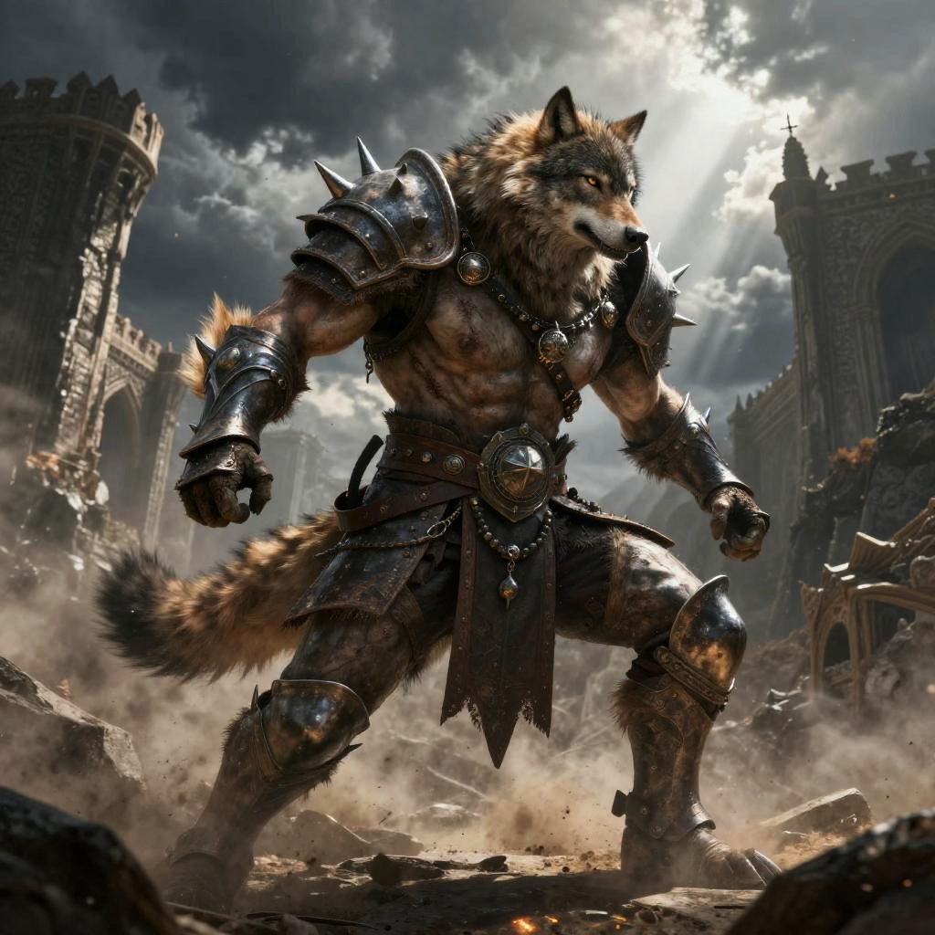 Scarred hawk-headed gladiator adorned with blood-stained bronze armor striking a heroic pose in twilight desert ruins with scattered crumbling columns and drifting sand, muscles taut and defined, fur or skin shimmering under harsh light, battle scars prominent, adorned with warrior regalia and talismans, heat haze and drifting grit, god rays and volumetric beams, epic and powerful atmosphere, ultra-detailed textures on fur, skin, metal, and leather, micro-scratches and weathering, dynamic foreground elements, long dramatic shadows, dramatic photoreal fantasy with rich textures and warm atmospheric glow.