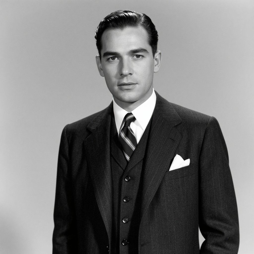 Black and white studio portrait of a man wearing a fitted three-piece pinstripe suit with a white shirt, striped tie, and pocket square. He has slicked-back hair and an expression conveying confidence. The vintage men's fashion style and tailored look highlight classic elegance.