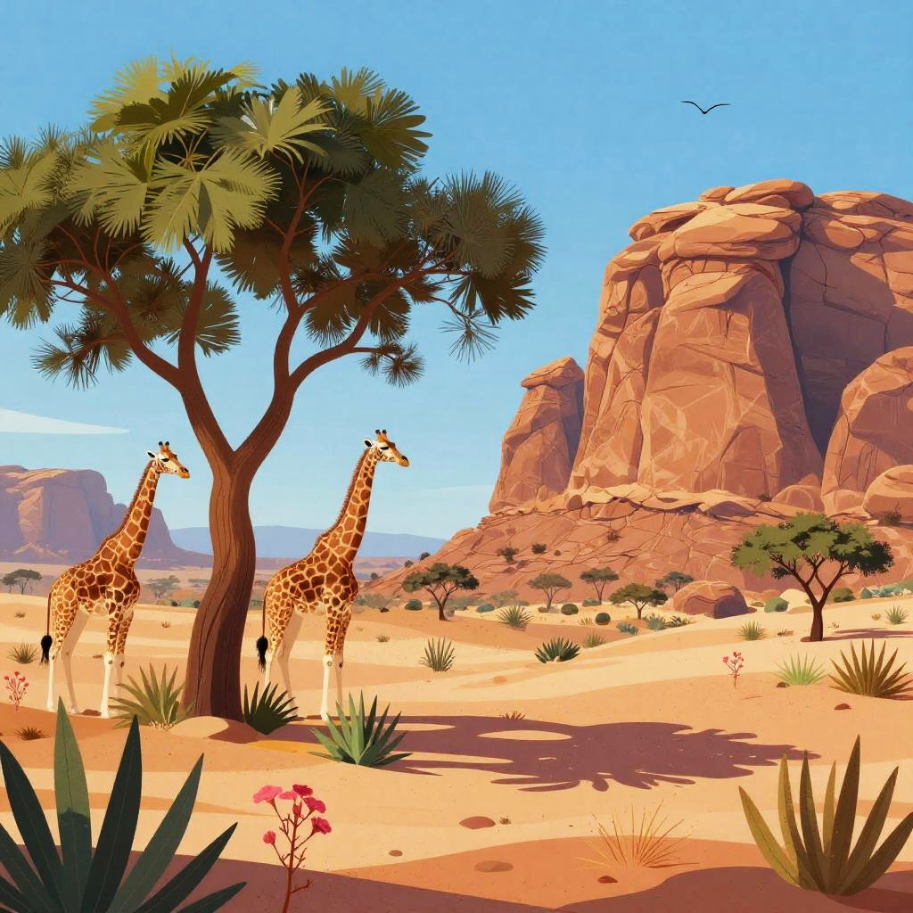 This is a colorful, digital illustration of a desert landscape. A large, bushy tree stands to the left, with two giraffes in the background. To the right, there's a towering rock formation with smooth, red-brown layers. The foreground has various desert plants, including pink flowers and green succulents. The sky is bright blue with a few birds flying. The scene is vibrant and detailed.