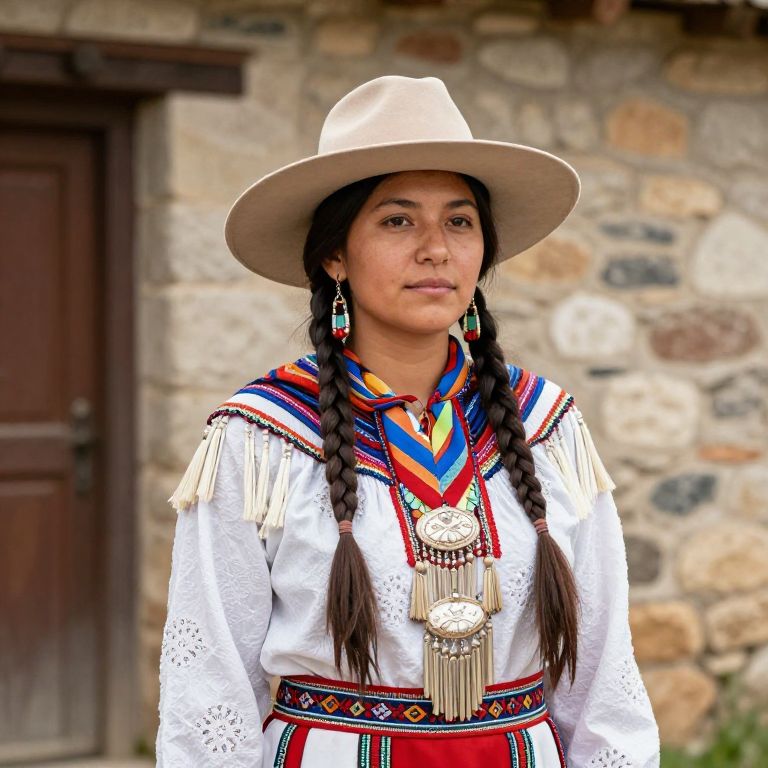 Female native american girl with a hat on her head, wearing a traditional native dress with a wide brimmed hat and a scarf around her neck. She is standing in front of a stone building with a door on the left side.