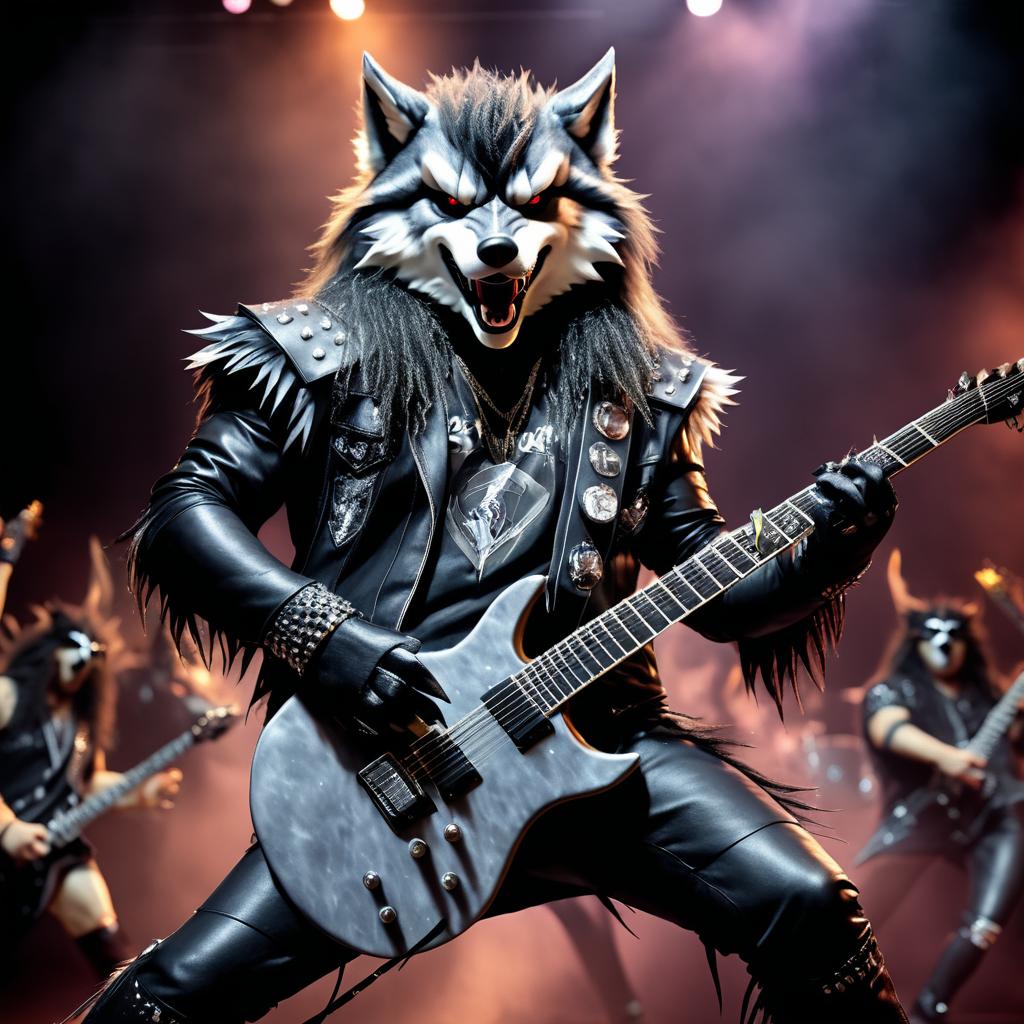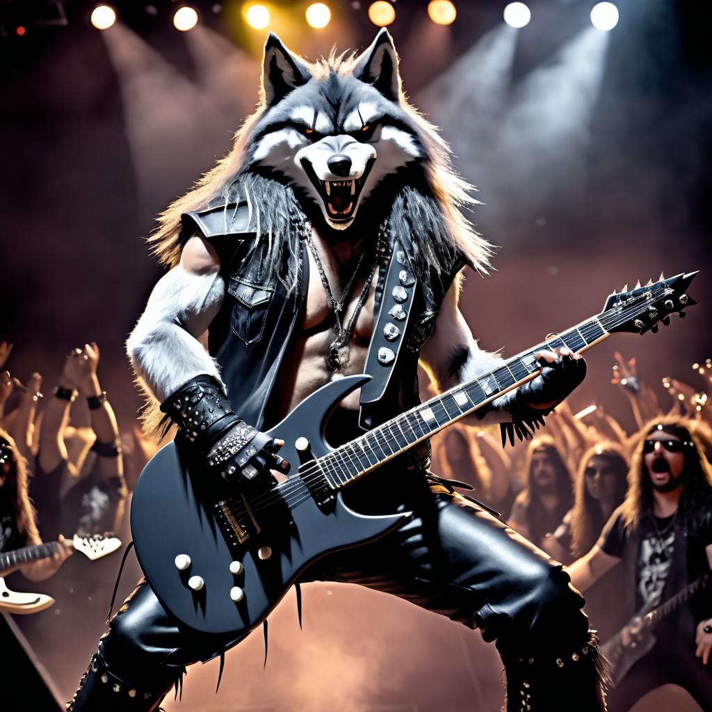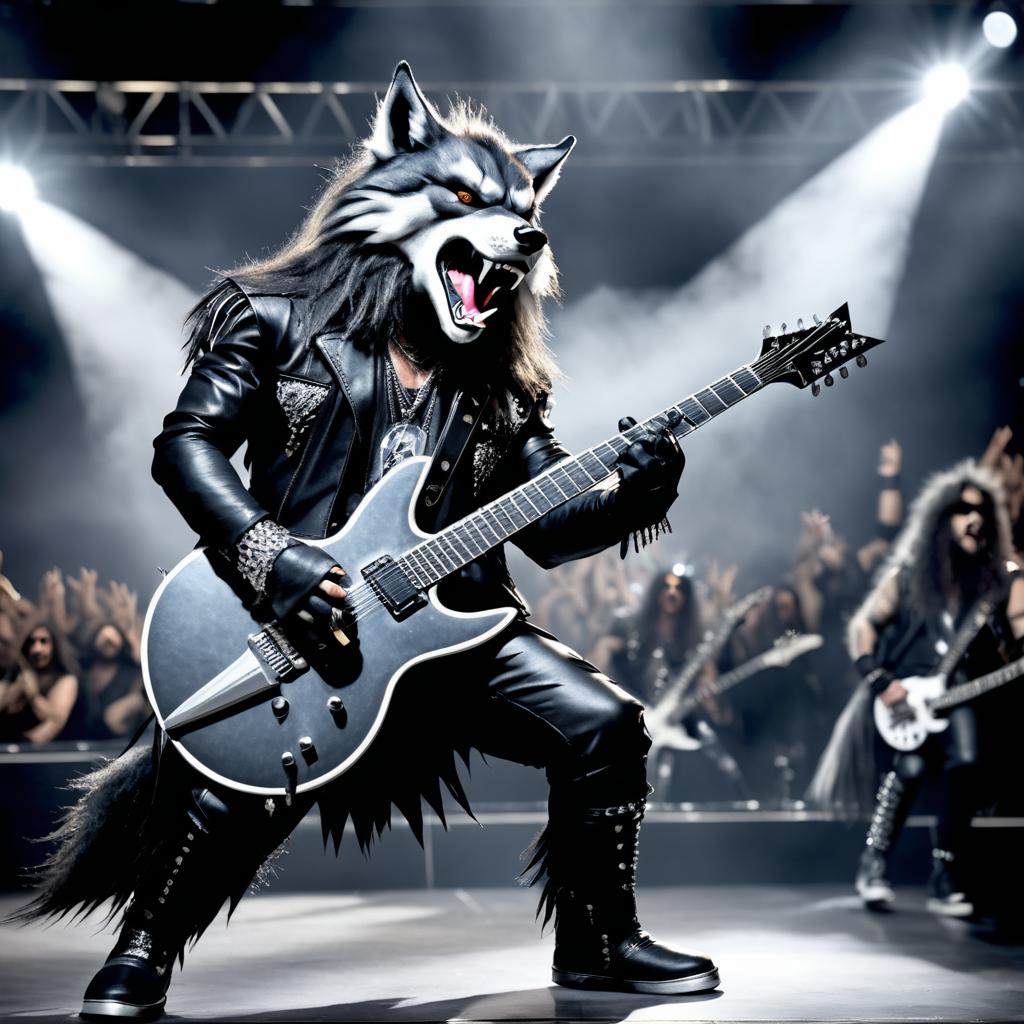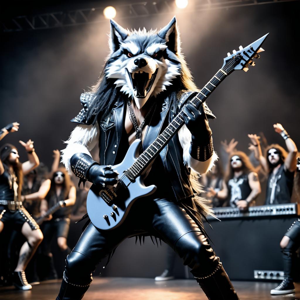 Anthropomorphic wolf dressed as a heavy metal rock star, playing guitar on stage before a headbanging crowd, dark and photorealistic.