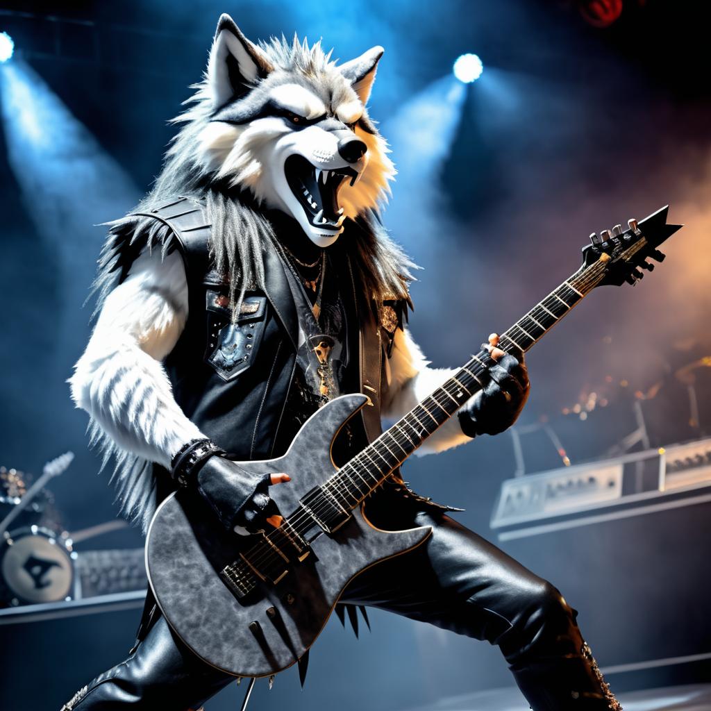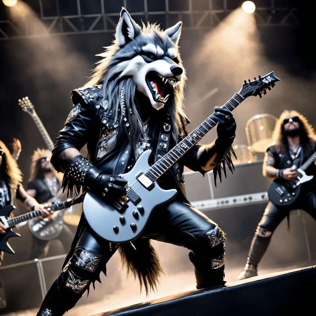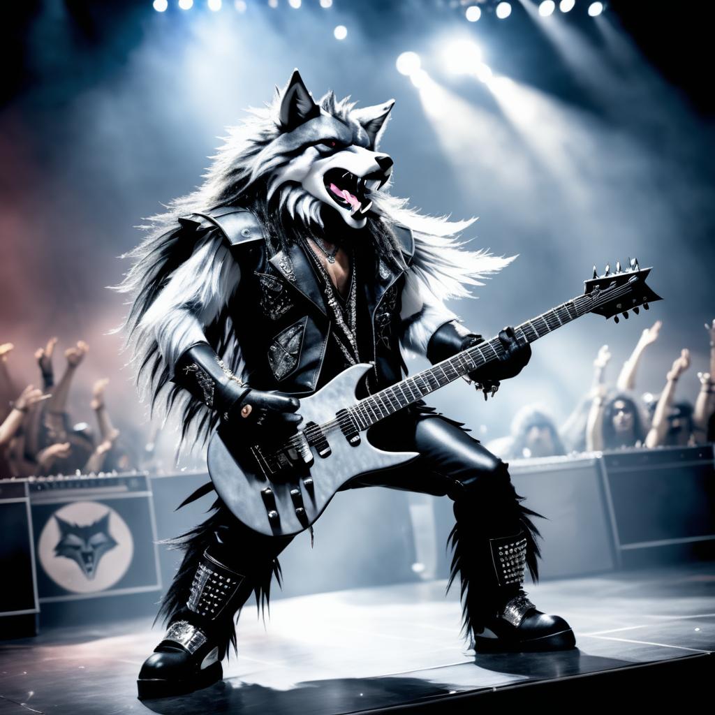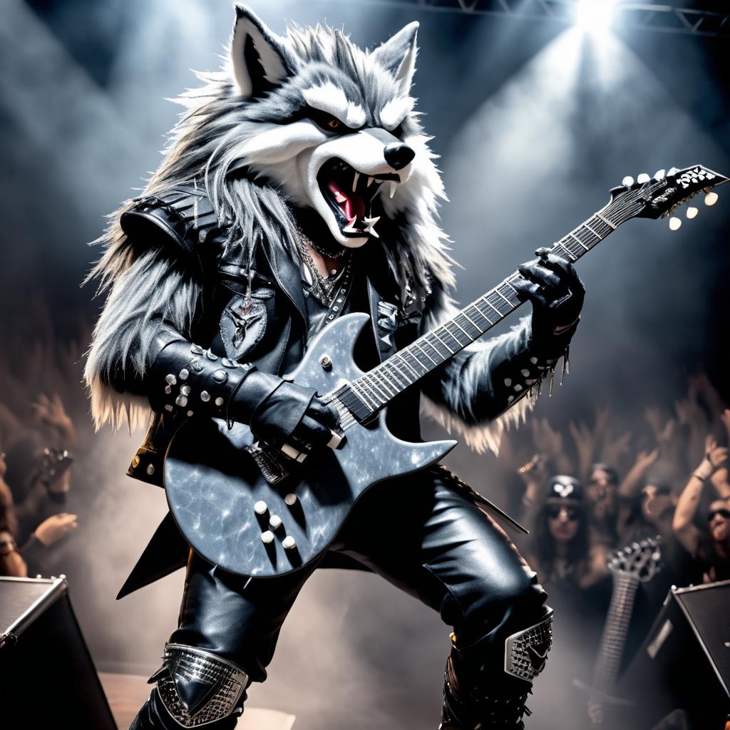 Anthropomorphic wolf dressed as a heavy metal rock star, playing guitar on stage before a headbanging crowd, dark and photorealistic.