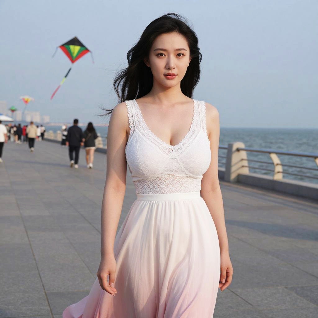 Photograph of an Asian woman with straight black hair, wearing a blue, V-neck dress, standing by a calm lake at dusk.