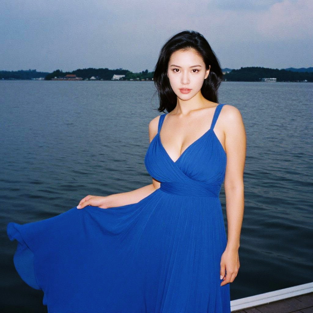 A voluptuous woman in a royal blue chiffon dress with a V-neckline and flowing silhouette stands gracefully on a serene lakeside dock, captured in the nostalgic style of a disposable camera. Sexy. Pretty face and beаutiful eyes. Big breasts