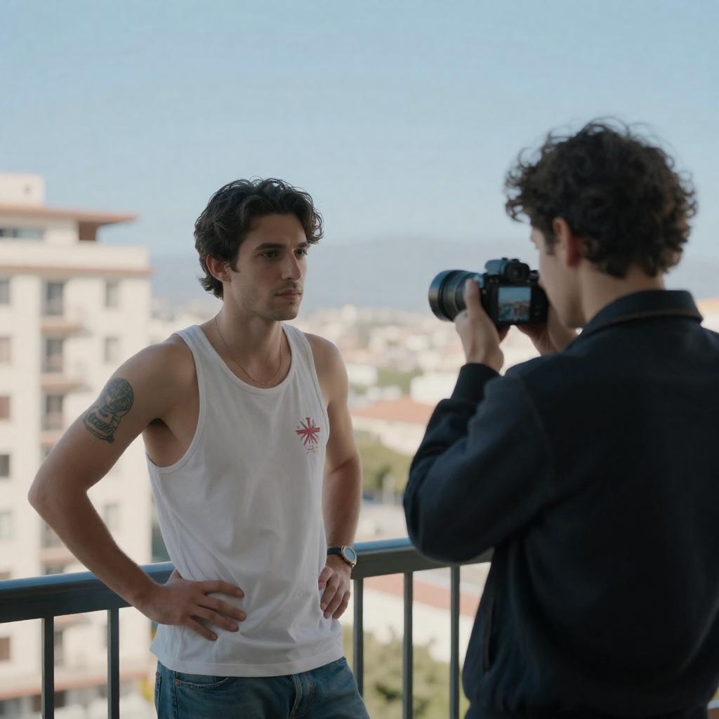 Photograph of two men on a balcony with a cityscape and hotel in the background. The man on the left, with dark hair, a tattoo on his arm, and a white tank top with a red graphic, stands with his hand on his hip. The man on the right, with curly hair, wears a dark jacket and holds a camera, taking a photo of the first man. Bright blue sky and distant mountains are visible.