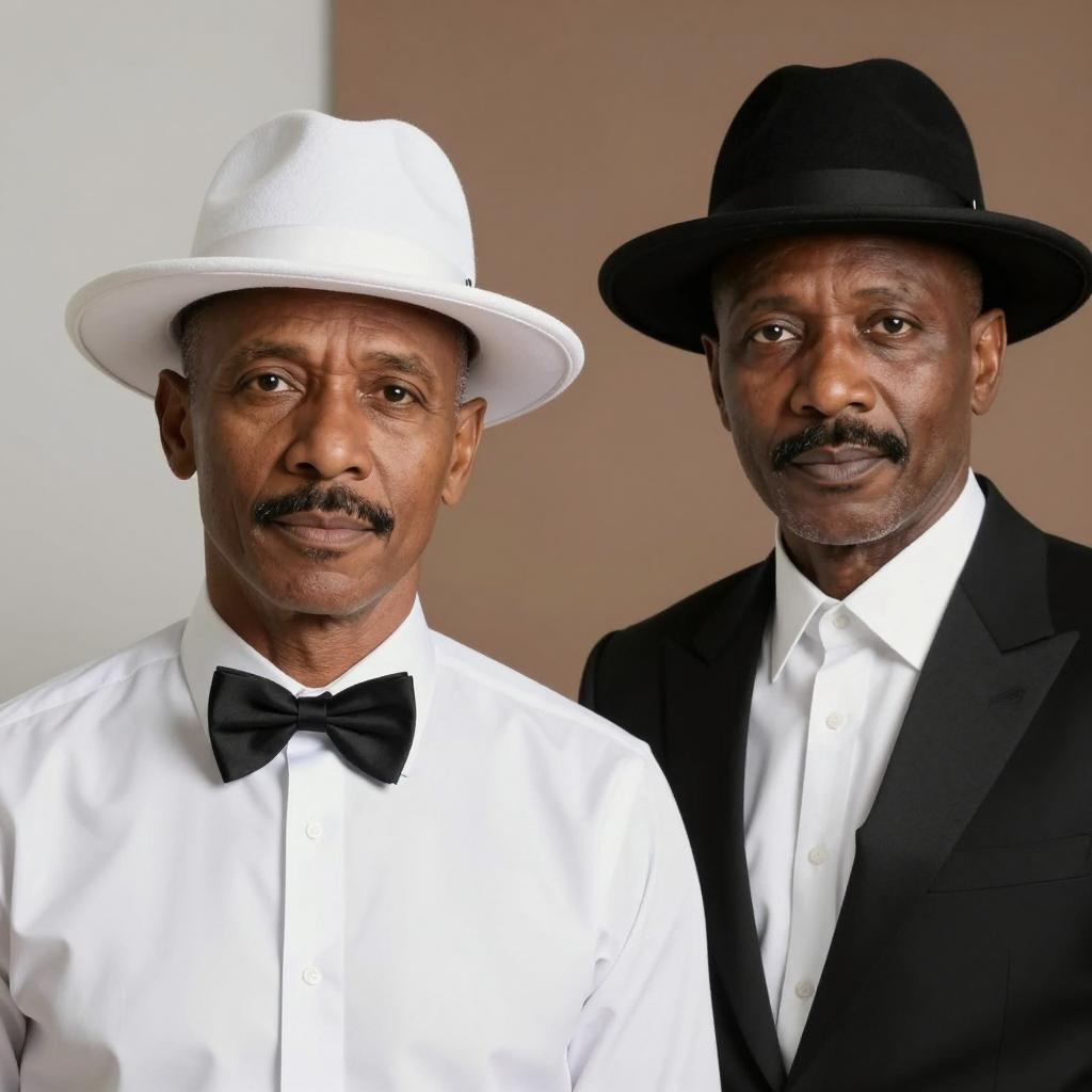 Two men with dark skin, black mustaches, white dress shirts, black vests, red ties, and black bowler hats. The man on the left wears a white fedora, the man on the right wears a black fedora. Both have serious expressions.