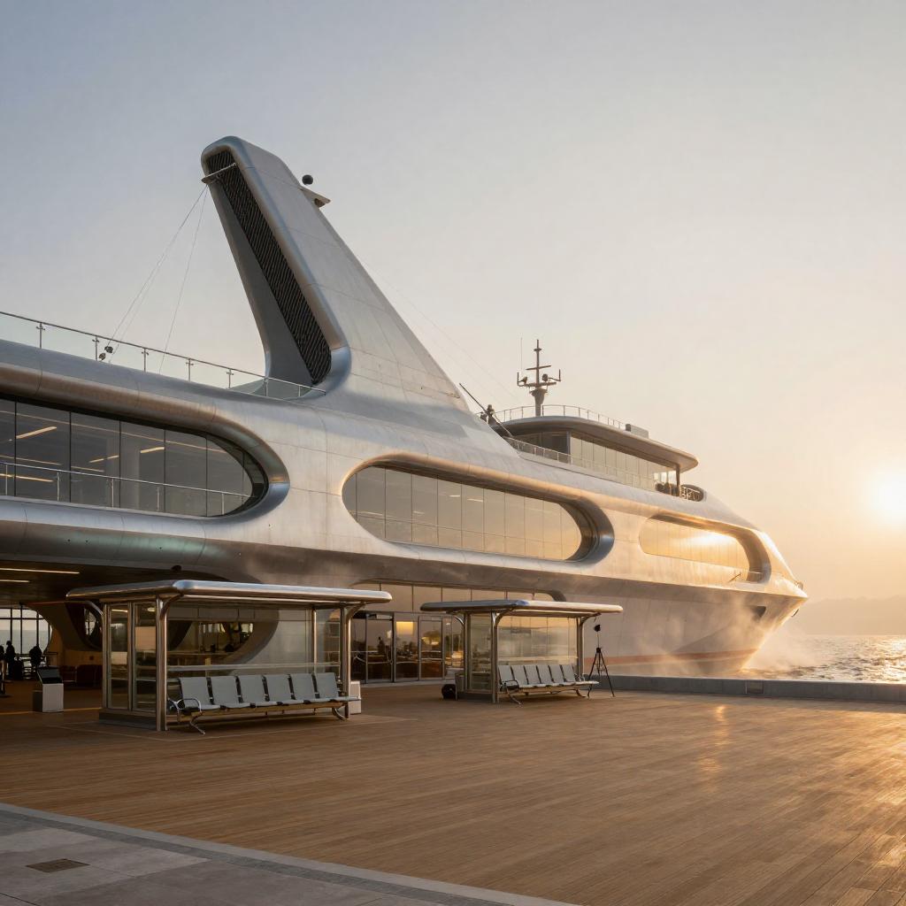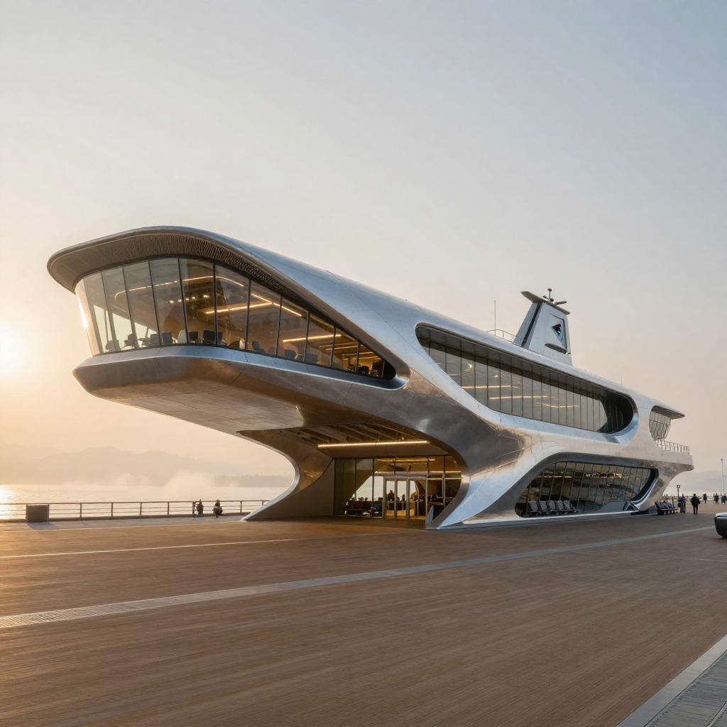 Futuristic Coastal Ferry Terminal at Golden Hour