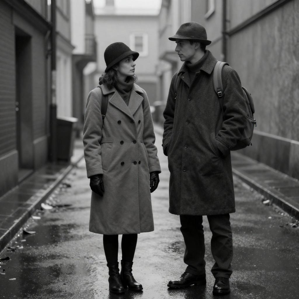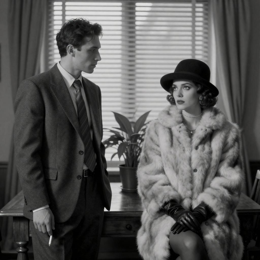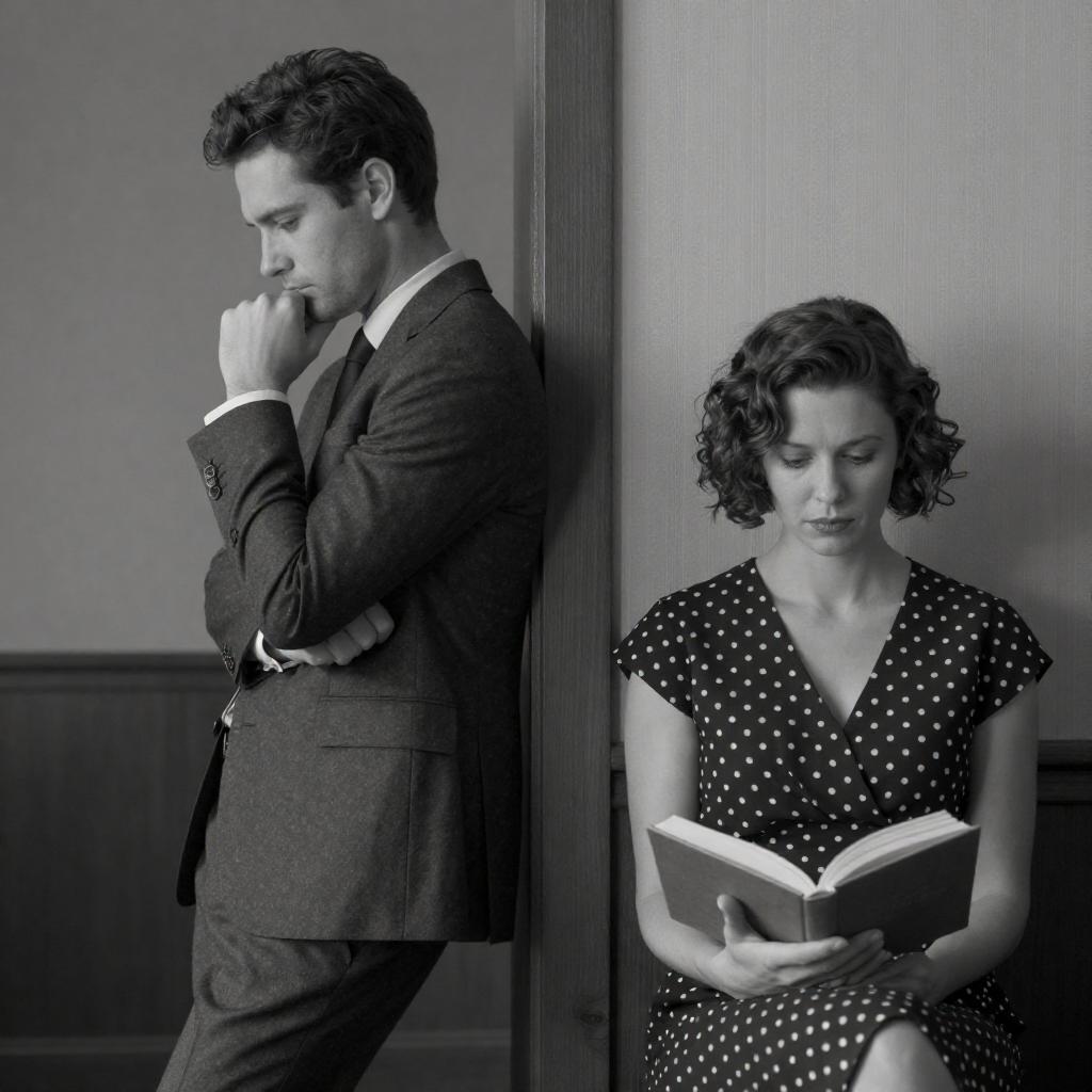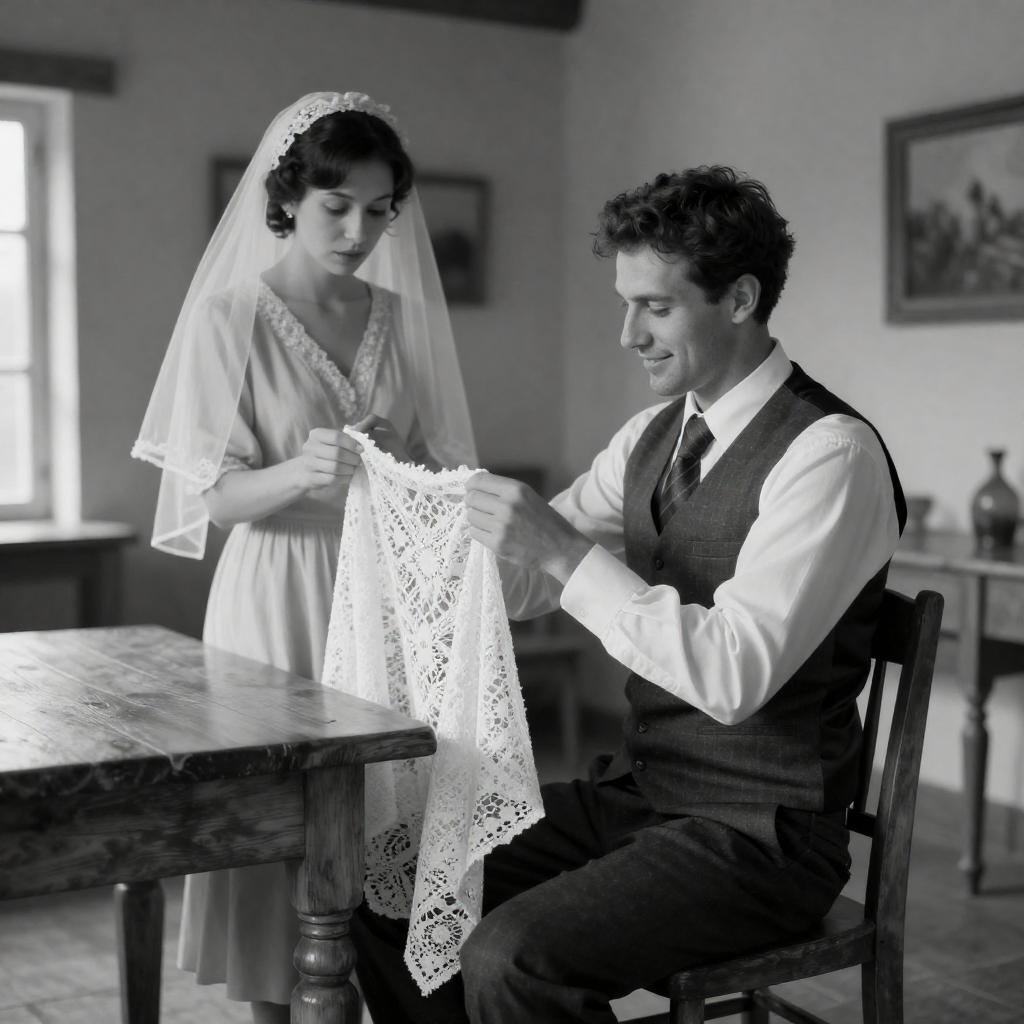 Black and white photograph. Woman with light hair in vintage dress and lace collar stands, holding the head of a man in a plaid cap and shirt, leaning against a barred window. Dark room, stairs in background. Woman's expression focused, man's expression obscured. Man in lower right, woman in upper left.