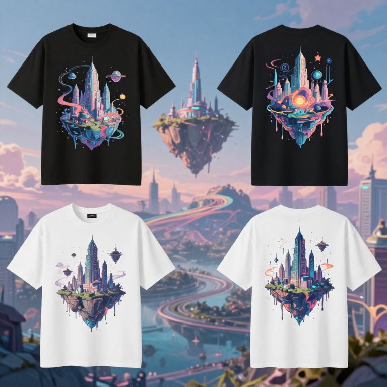 Photograph of two black T-shirts and two white T-shirts, each featuring a vibrant, digital illustration of a futuristic cityscape with floating islands, towering skyscrapers, and colorful, swirling elements. The black T-shirts have a glossy finish, while the white T-shirts are matte. The background includes a digitally rendered cityscape with pink and purple sky, floating islands, and winding roads, giving a sci-fi aesthetic. The artwork on the T-shirts is symmetrical and neon-lit, with a mix of blues, pinks, purples, and whites. The T-shirts are arranged in a grid, with the background cityscape visible between them.