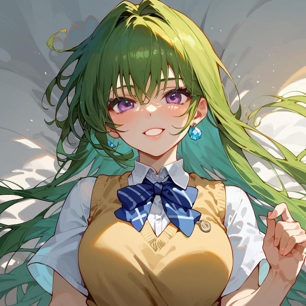 YabukiKentarou, to love-ru, score_9, score_8_up, score_7_up run elsie jewelria, purple eyes, green hair, long hair, medium breast, school uniform, skirt, sweater vest, looking at viewer, light smile, portrait