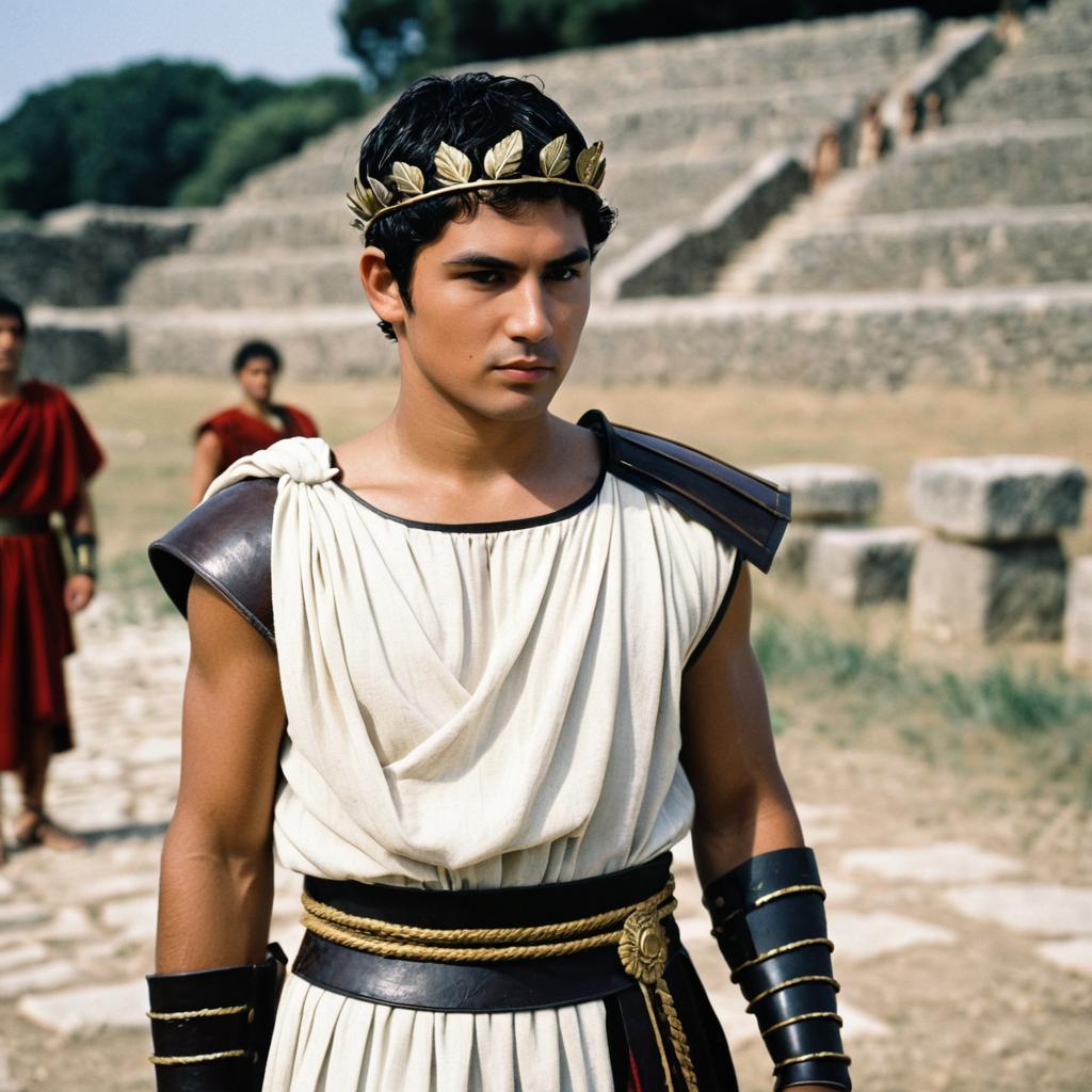 Roman slave costume,male focus, 1boy, realistic, greco-roman clothes, solo focus, looking at viewer, blurry, blurry background, black hair, closed mouth, laurel crown, ancient greek clothes, bracer, standing, short hair, outdoors