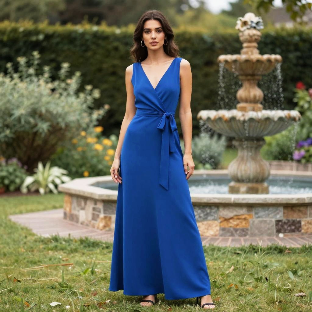 Garden Party Attire, woman in a blue dress standing in a garden