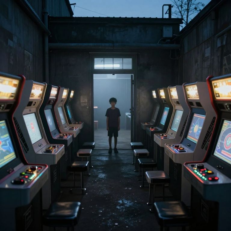 Photograph of a lone person standing in a dimly lit, misty arcade hallway, surrounded by brightly lit, colorful arcade machines.