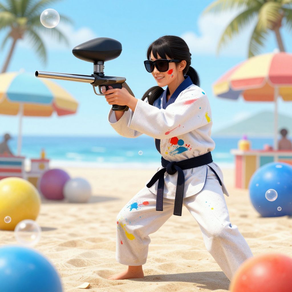Evil beautiful japanese woman is playing paintball, she is wearing kungfu clothes, full with paints, smiling, sunglass, on beach, colorful balls umbrellas, photorealistic, ingredients, full with white and colorful bubbles, vivid colorful splashed paint bubbles, Digital illustration, very vibrant colors, soft lighting, beach palm trees background, sharp lighting, 8K, octane render, trending on ArtStation, digital art