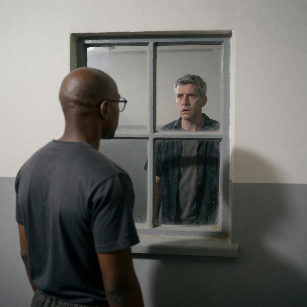Photograph of a prison cell. Bald black man with glasses faces a grimy window. Scared white man with short gray hair stands inside, looking out. Sunlight casts shadows on white wall. Man inside has intense expression. Window has four panes.