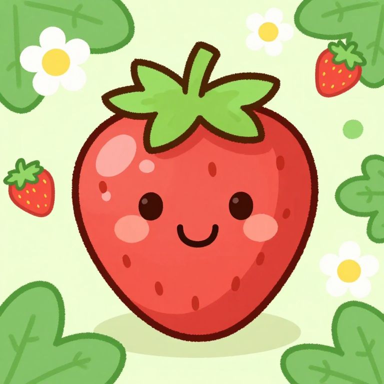 Byzantine Icon cute smiling strawberry with strawberry plant flowers in the background drawn in kurzgesagt style,