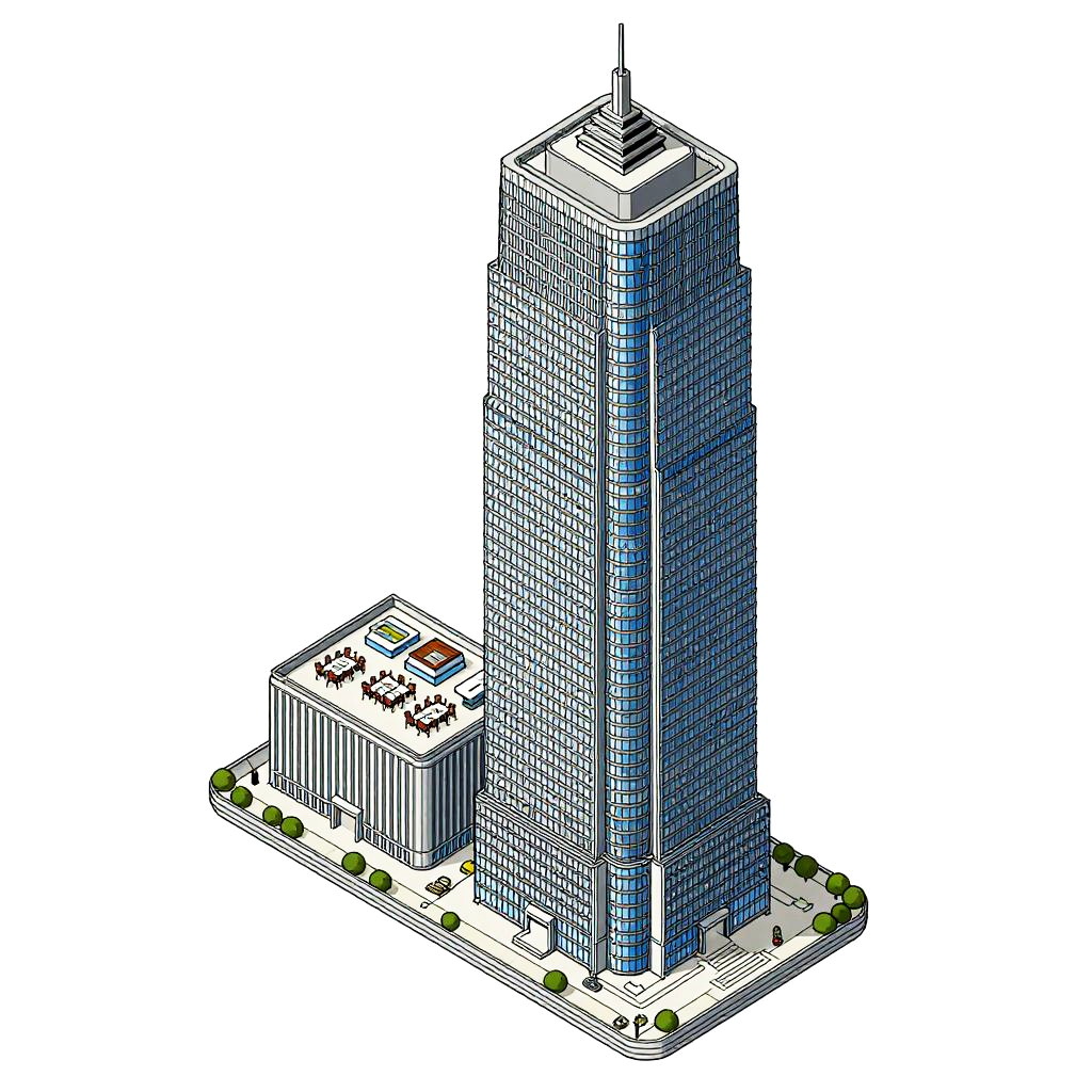 Skyscraper floor plan in isometric perspective, highlighting structural elements, glass facades, mechanical rooms, conference areas, and rooftop amenities, digital art with clean lines