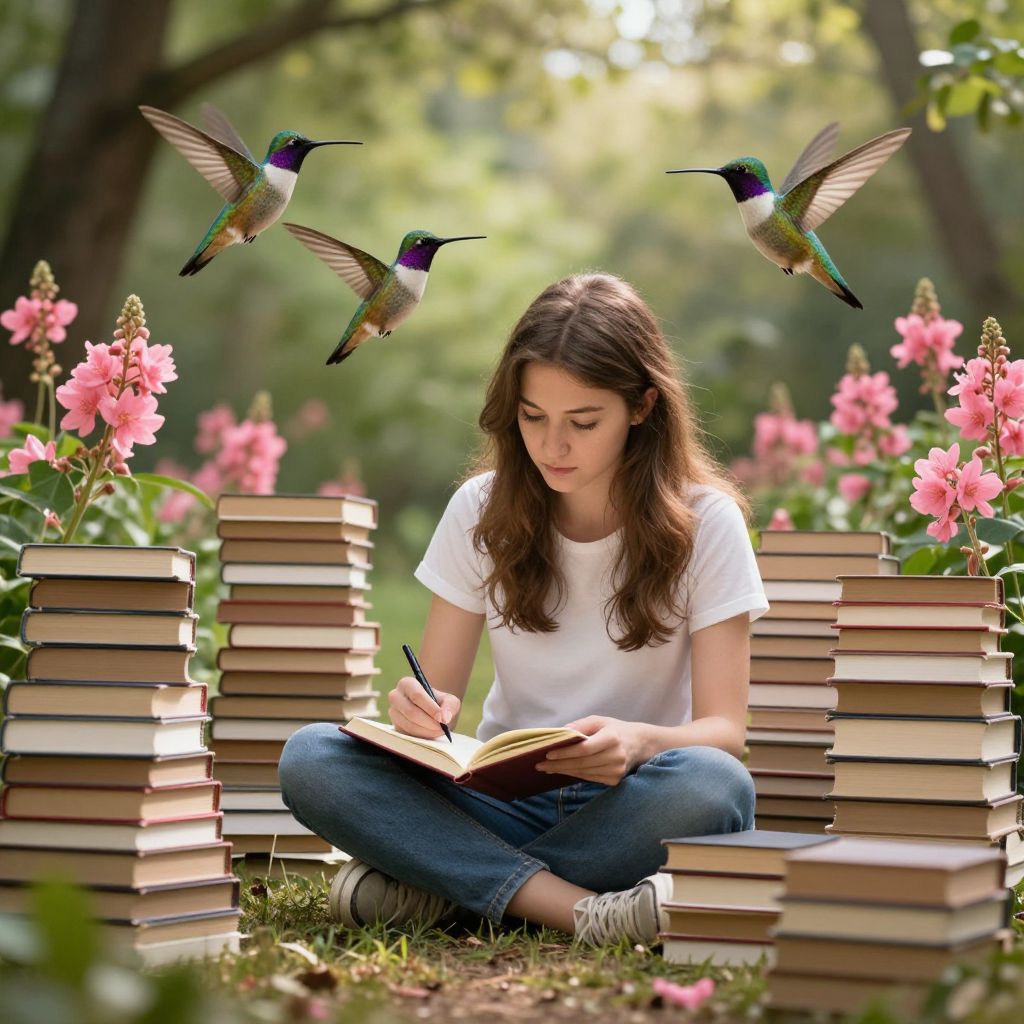 Photograph of a young woman with long brown hair, wearing a white t-shirt and blue jeans, sitting cross-legged on grass amidst tall stacks of books. She is focused on writing in an open book with a pen. Two vibrant hummingbirds with iridescent green and purple feathers fly above her, creating a magical atmosphere. Pink flowers and lush greenery surround her, with sunlight filtering through the trees in the background. The scene is serene and whimsical, blending nature with a sense of literary enchantment.