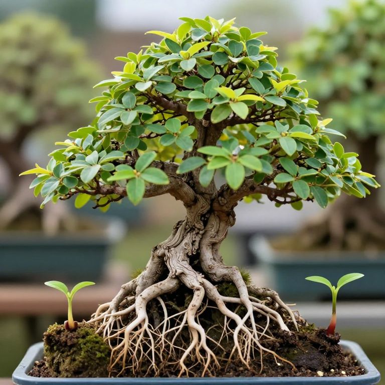 Photograph of a bonsai tree with vibrant green leaves, exposed roots, and small seedlings, set in a blurred garden background.