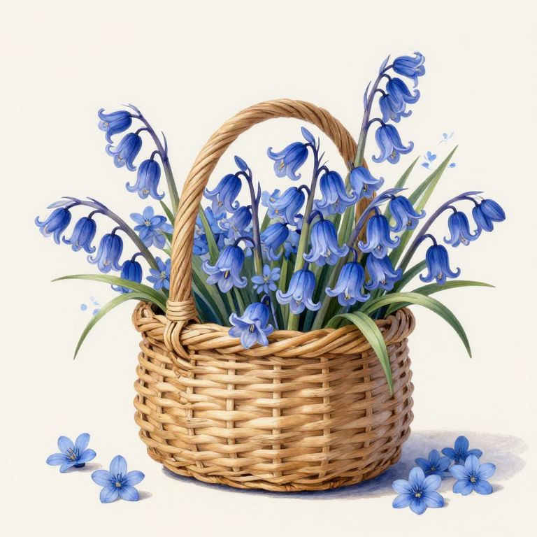 The image presents a beautifully illustrated basket brimming with an array of bluebell flowers and blue blossoms, rendered in a friend magazine style. The basket, crafted from woven straw, sits centrally, its handle curved gracefully. Surrounding the basket are various bluebell flowers, their petals a rich, deep blue, interspersed with delicate blue blossoms that add a touch of softness to the scene. The flowers are arranged in a natural, somewhat scattered manner, with some leaning over the edge of the basket, as if they have been freshly picked. The background is a soft, neutral tone, allowing the vibrant blues of the flowers to stand out prominently. The overall composition is balanced, with the basket and its floral contents taking center stage, while the surrounding flowers create a sense of depth and abundance. The illustration captures the essence of a serene, natural moment, evoking a feeling of tranquility and the simple beauty of nature.