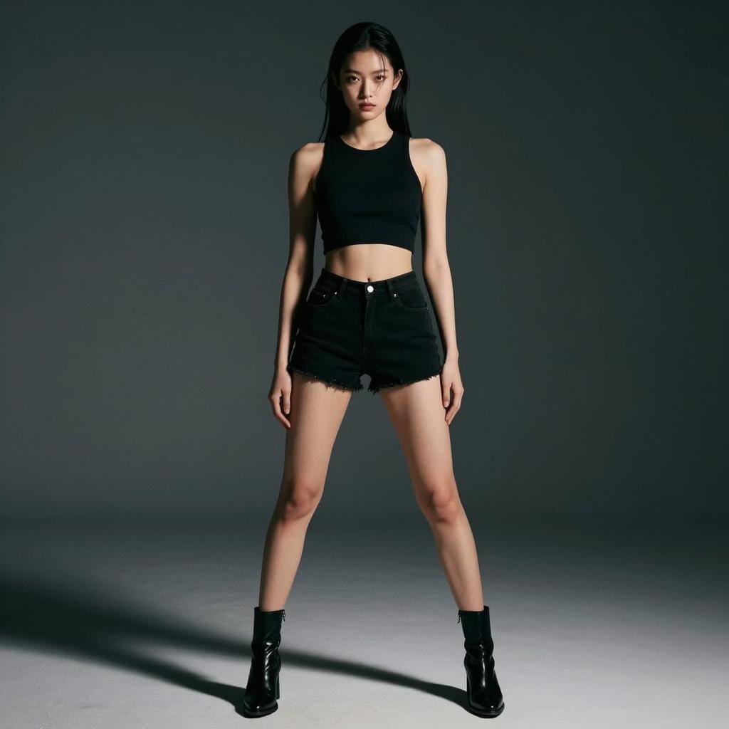 Portrait of a slim young Asian woman standing in a power stance with legs wide apart, wearing a black crop top, black denim shorts, and black heeled boots. The image features dramatic directional lighting and strong shadows that emphasize her silhouette against a very dark, almost black background, creating a moody, cinematic, and artistic atmosphere with a grainy film texture.