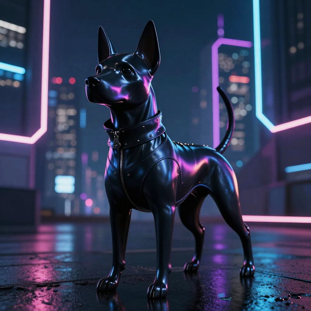 Latex dog costume, hyper-realistic anthropomorphic dog wearing a shiny black latex suit, futuristic urban background, cinematic lighting, detailed textures, vibrant colors