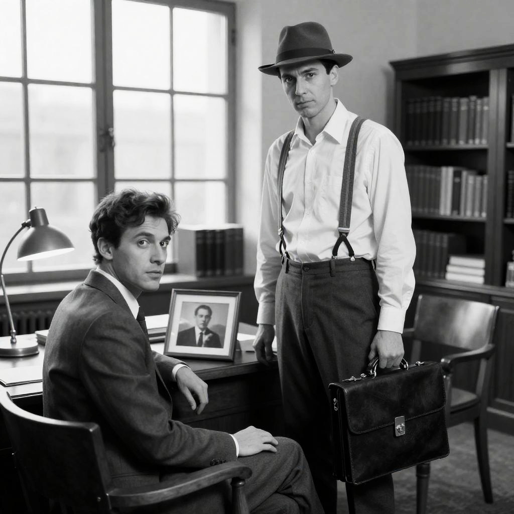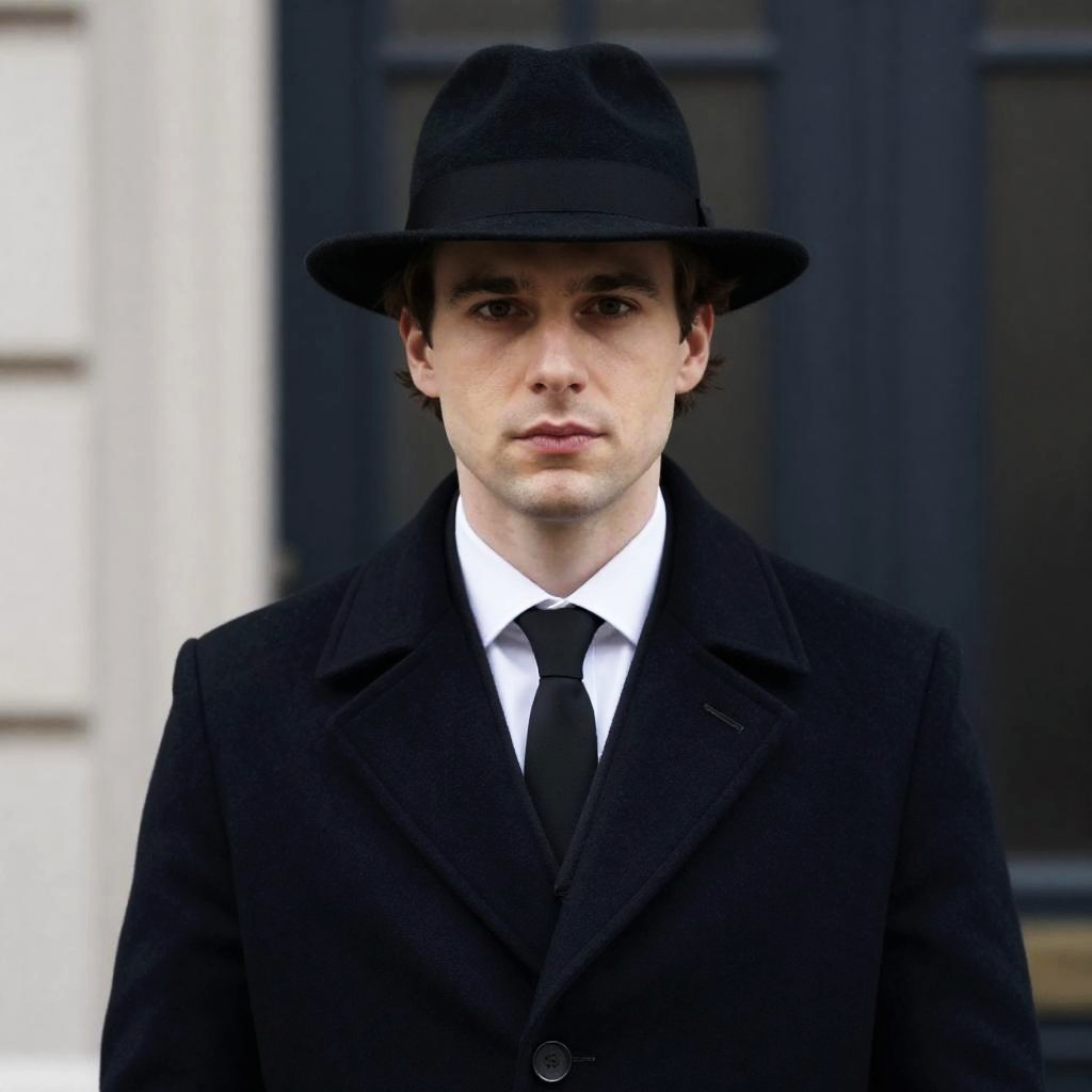 Man in dark coat, black gloves, and fedora sitting in wooden library chair. Stacks of books on shelves behind him. Desk in foreground with books and a computer monitor. Serious expression. Indoor setting. Wooden doors with glass panes in background. Soft lighting.