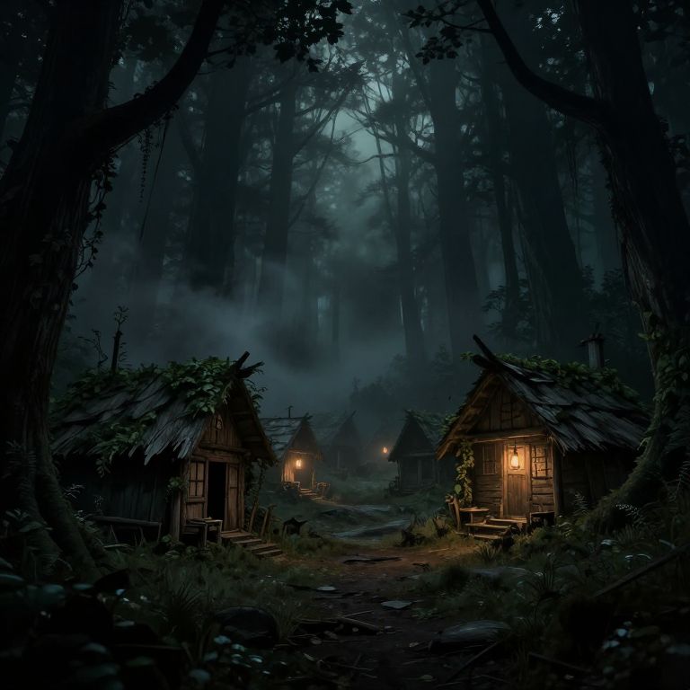 Mysterious, dark forest at night with glowing lanterns in rustic, thatched huts. Mist shrouds trees, creating an eerie, enchant