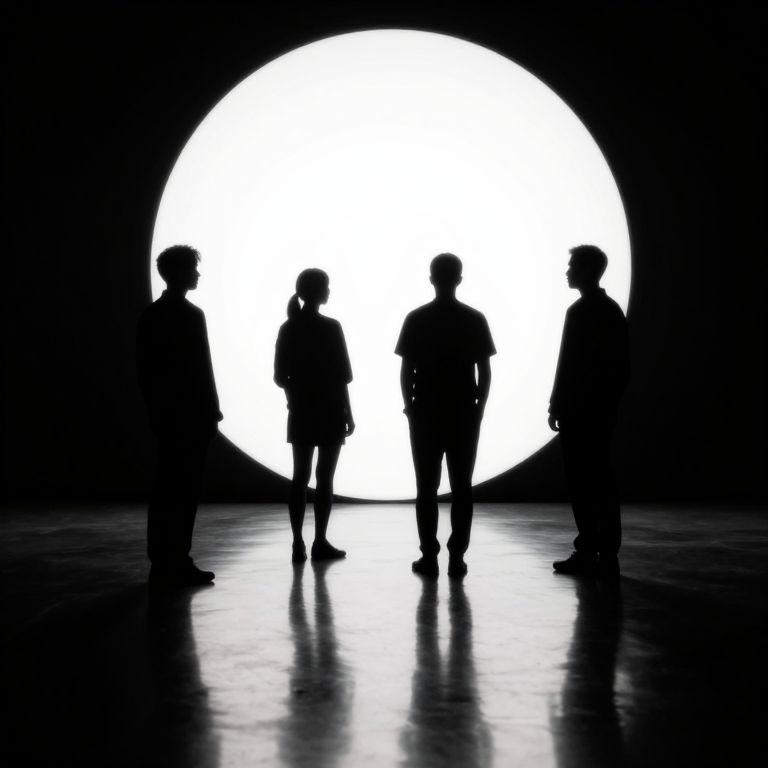 Silhouetted figures stand in a semi-circle around a luminous, oversized circular light source, their reflections cast sharply on the glossy floor, creating an ethereal atmosphere where tangible forms interact with shadowy silhouettes.