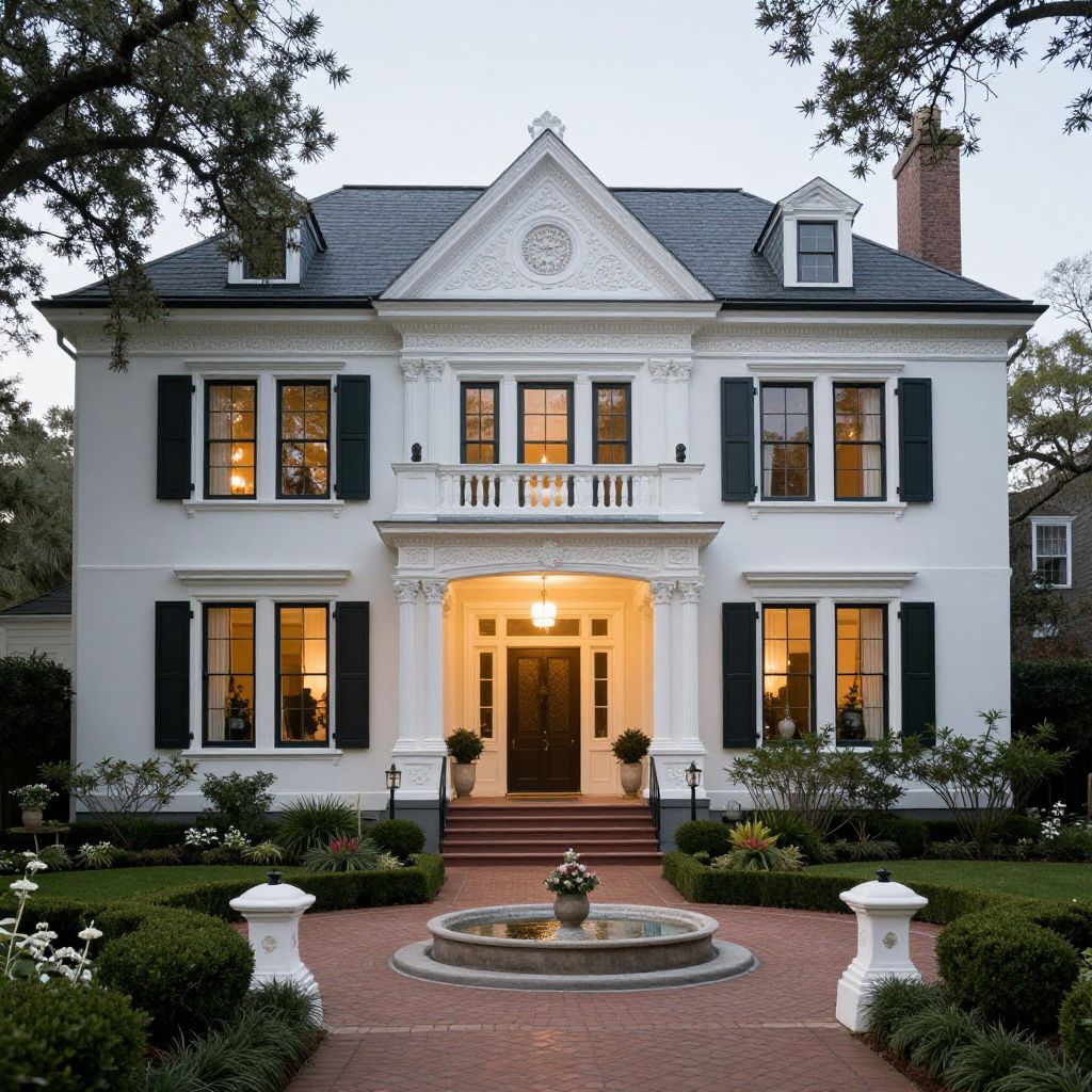 Stately Charleston mansion showcases Patricia Altschul's elegant design, featuring Mario's meticulous home decor with intricate architectural details, lush landscaping, and warm interior lighting that highlights its classic charm.