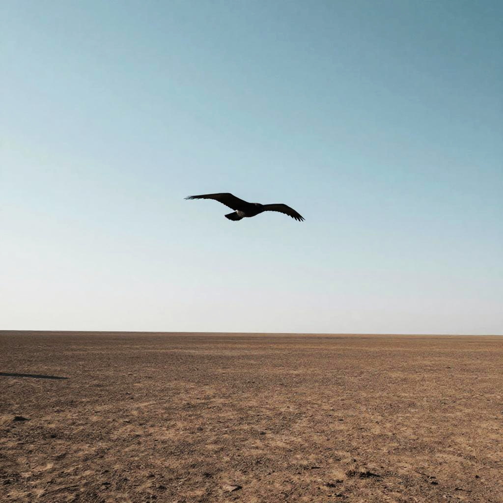 Photograph of a barren, flat landscape with a clear, bright sky in the background. Midway up, a dark, silhouetted object is airborne, appearing to be a large, indistinct animal or creature, possibly a bird or drone. The ground below is dry and brown, with a slight shadow in the lower left corner. The overall scene feels isolated and somewhat surreal.