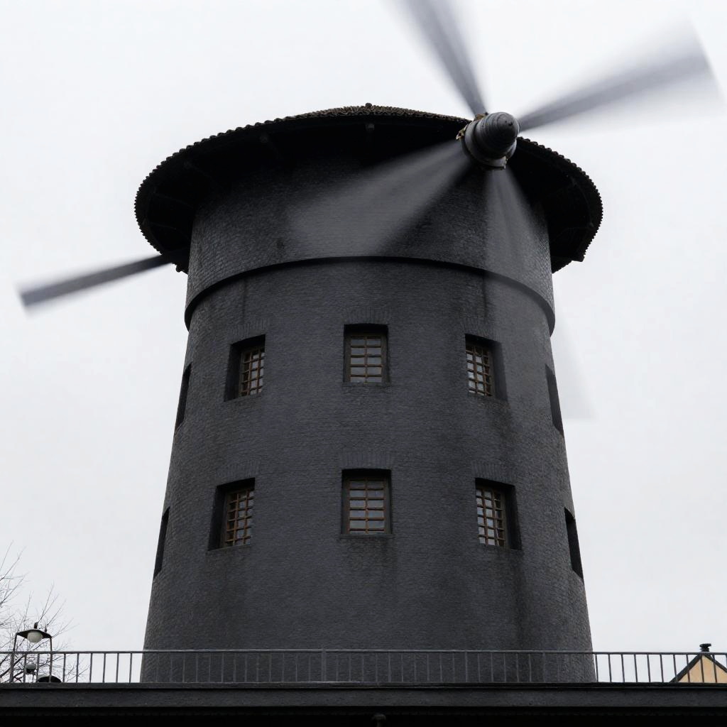 Photograph of a tall, cylindrical, black-brick windmill tower with a large, circular, darkened roof at the top. The tower has four rectangular windows, evenly spaced, and a metal railing at the base. The windmill's three blades are blurred in motion, creating a dynamic effect against the white, overexposed sky. The image has a high contrast, making the black bricks and structure stand out starkly. Bare tree branches are visible in the bottom left corner, adding a touch of nature to the industrial scene.