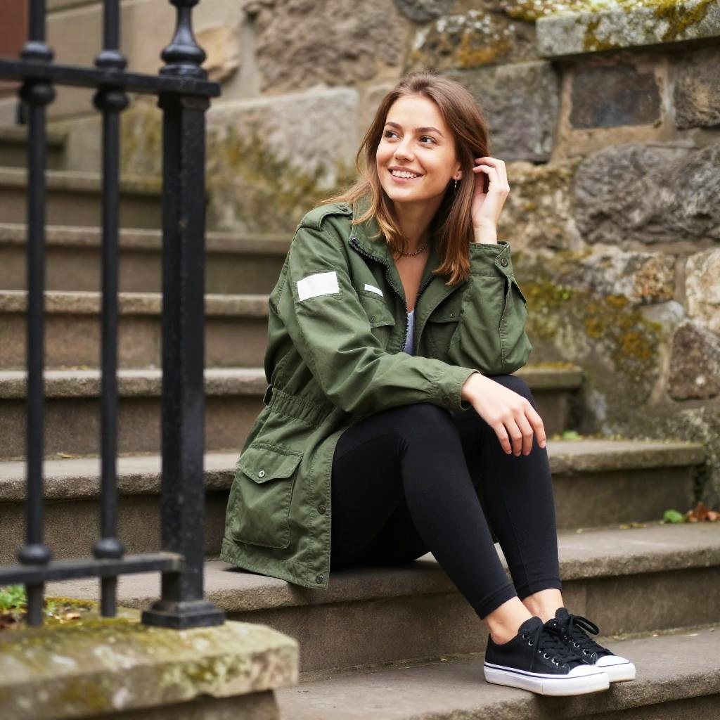 Photograph of a smiling young woman with light brown hair, sitting on a stone step outdoors. She's wearing a green military-style jacket with white patches, black leggings, and black and white sneakers. Her right hand touches her hair, while her left arm rests on her knee. A black, wrought-iron fence is in the foreground, slightly blurred. The background has a textured, mossy stone wall.