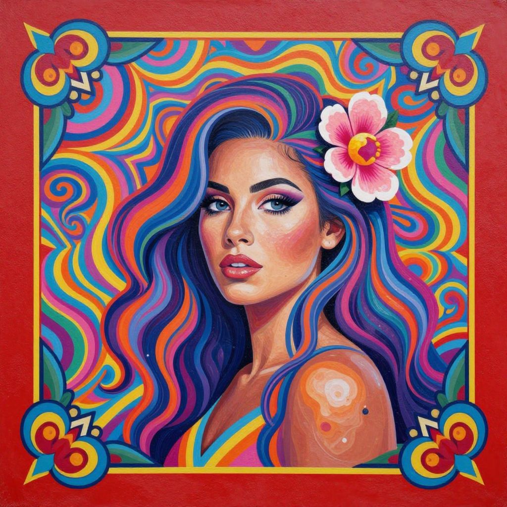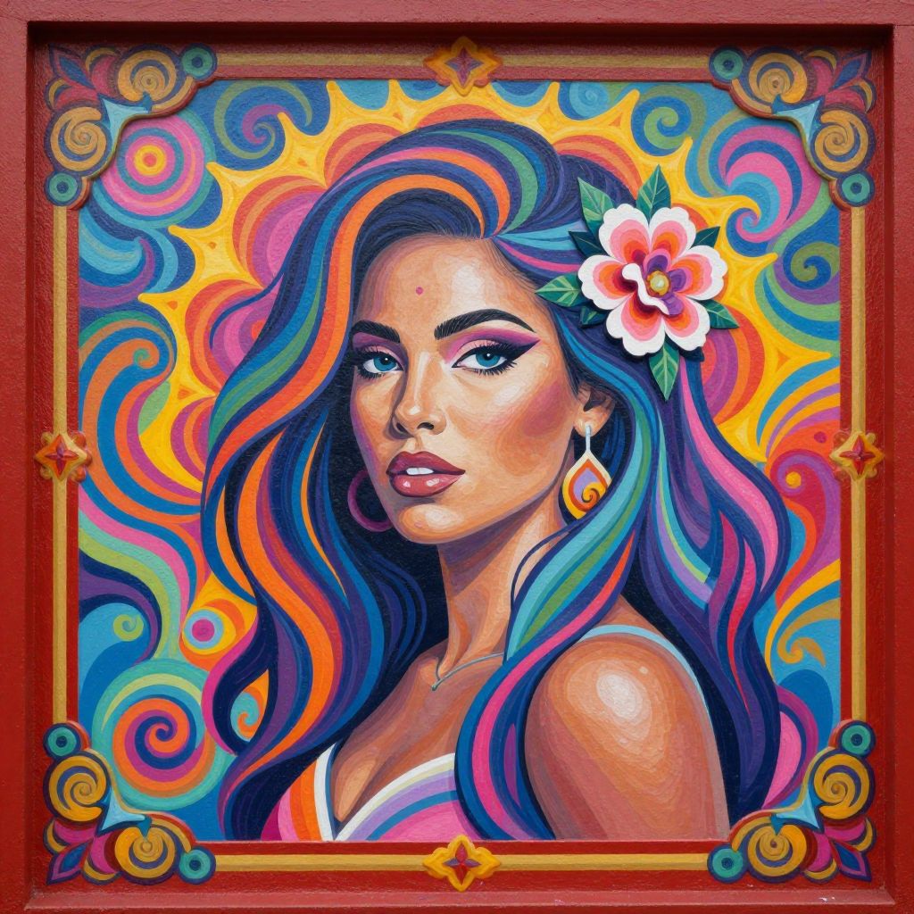 This digital art portrait features a striking woman with long, wavy, multicolored hair in shades of blue, purple, orange, and yellow. She has fair skin, bold eyebrows, and dark eyeliner, with a pink flower in her hair. She gazes directly at the viewer with a neutral expression. The background is a vibrant, psychedelic swirl of colors, including red, yellow, blue, and green. A yellow and blue decorative border frames the image, with small red and yellow flowers in each corner. The overall style is vivid and modern, with a pop-art influence.