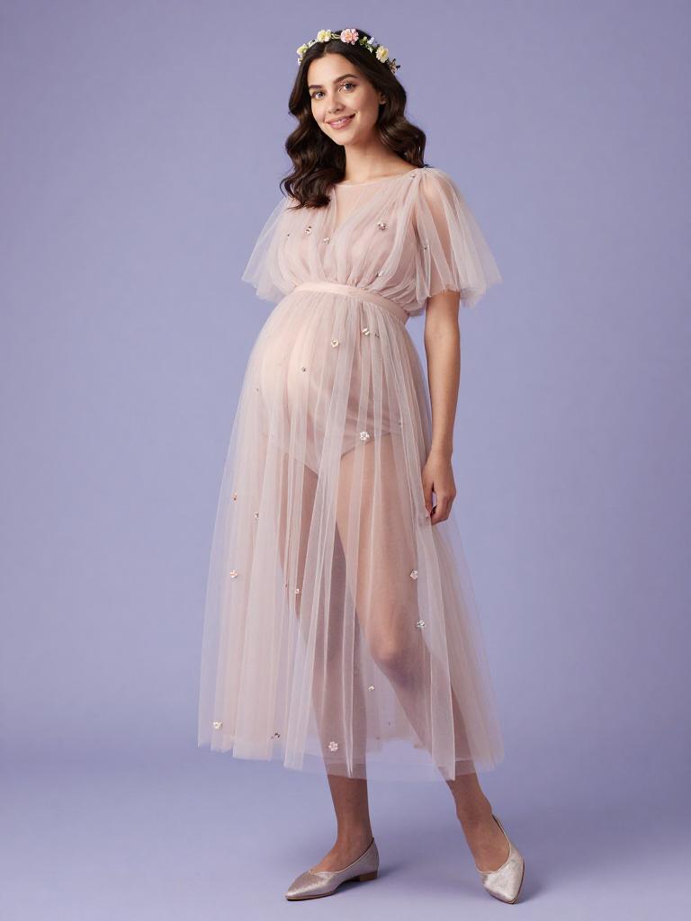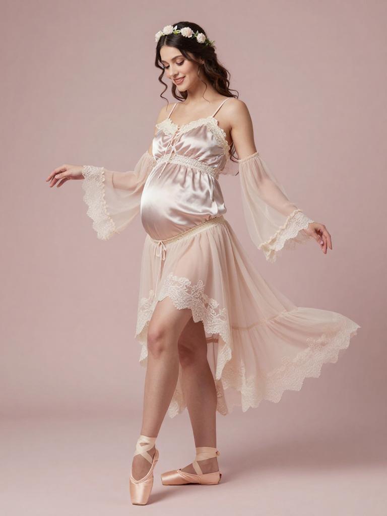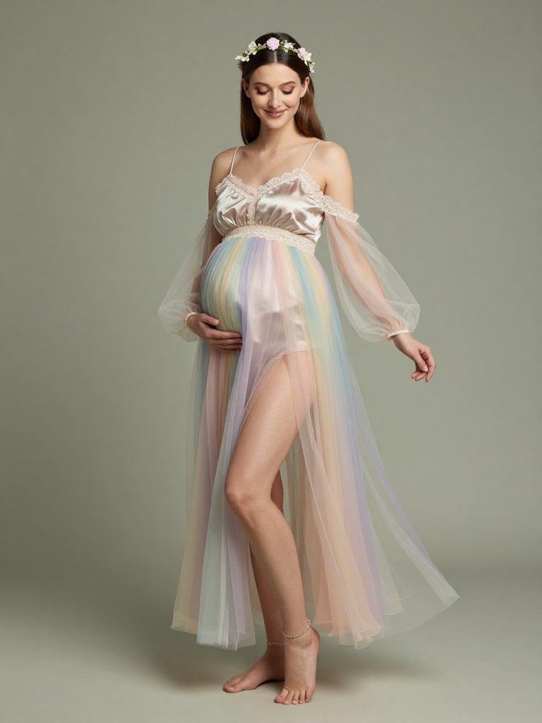 Fetish fashion outfit, sexy, dreamy pregnant woman smiling softly with silky dark hair half-up with loose tendrils and curvy, dressed in a fairy outfit, whimsical ethereal style, wearing silky camisole with lace trim and flowing sleeves with pastel ombré tulle skirt for a dreamy fairy look and soft satin flats with tiny bows, floral headband, Bohemian fairy-tale vibe, standing in soft pastel gradient studio backdrop studio background, soft dreamy lighting, high-end maternity fashion photography, ultra-detailed