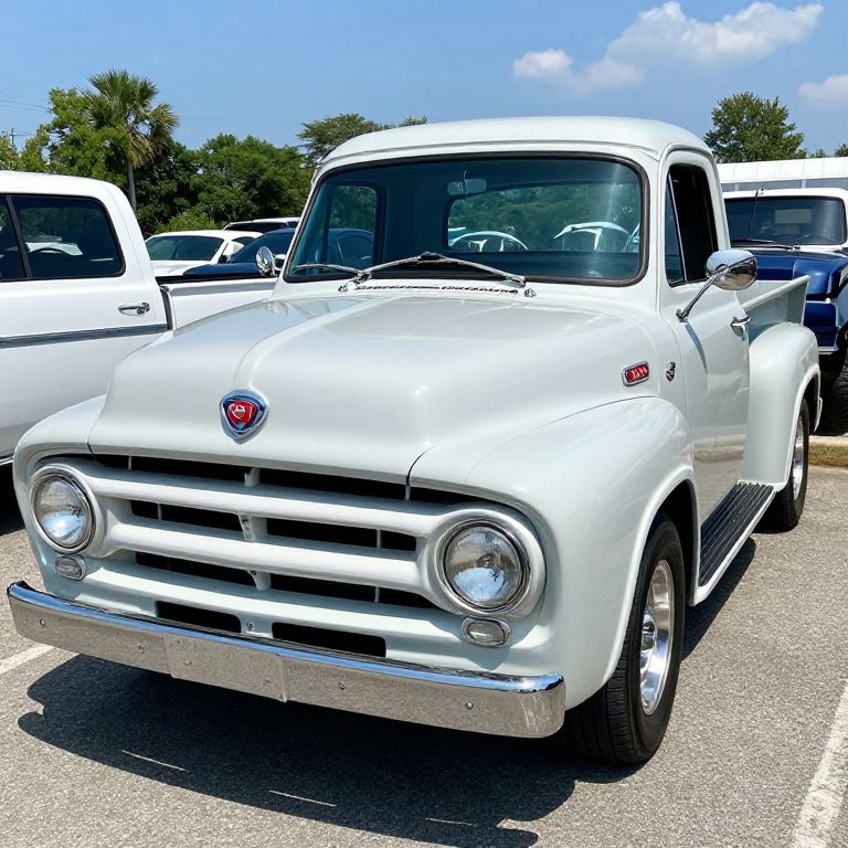 Classic 1953 Ford F100 pickup truck showcased in pristine condition, parked prominently in a sunny outdoor setting with modern vehicles visible in the background.