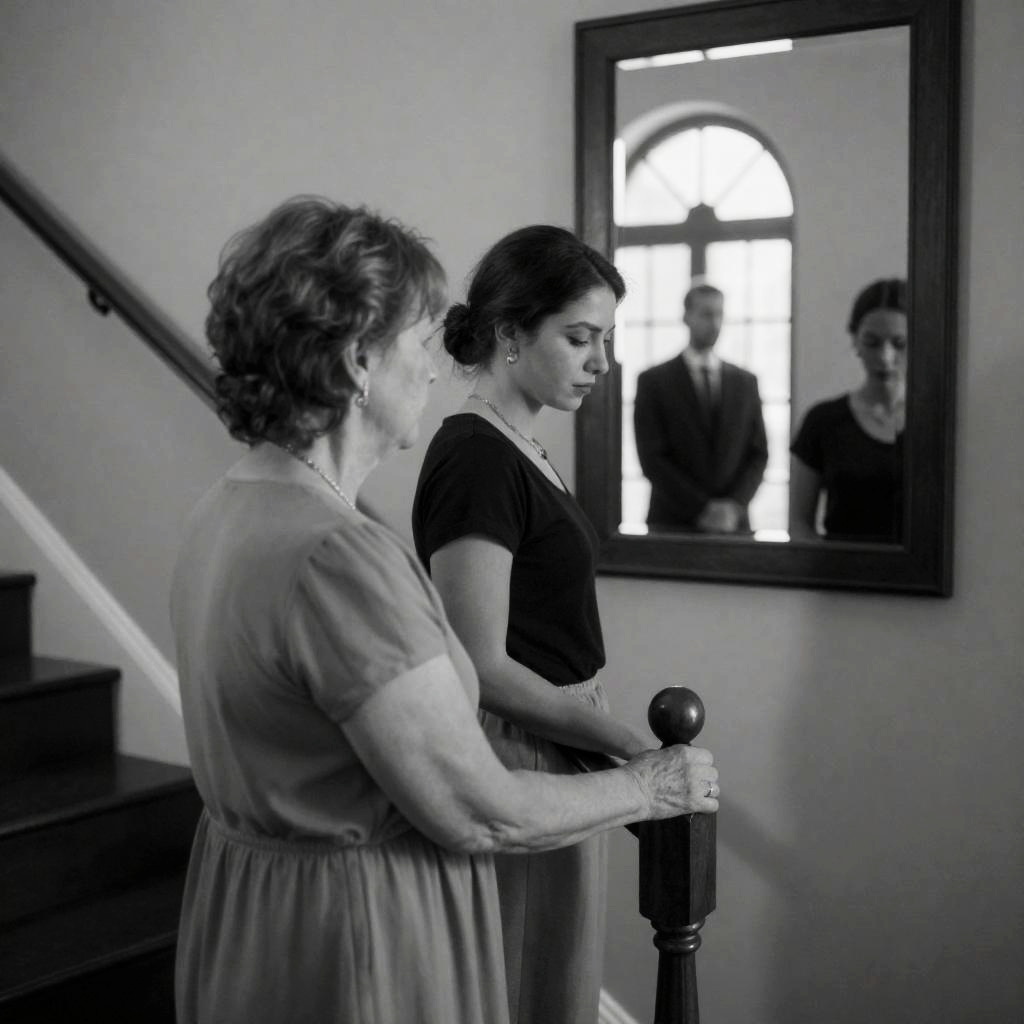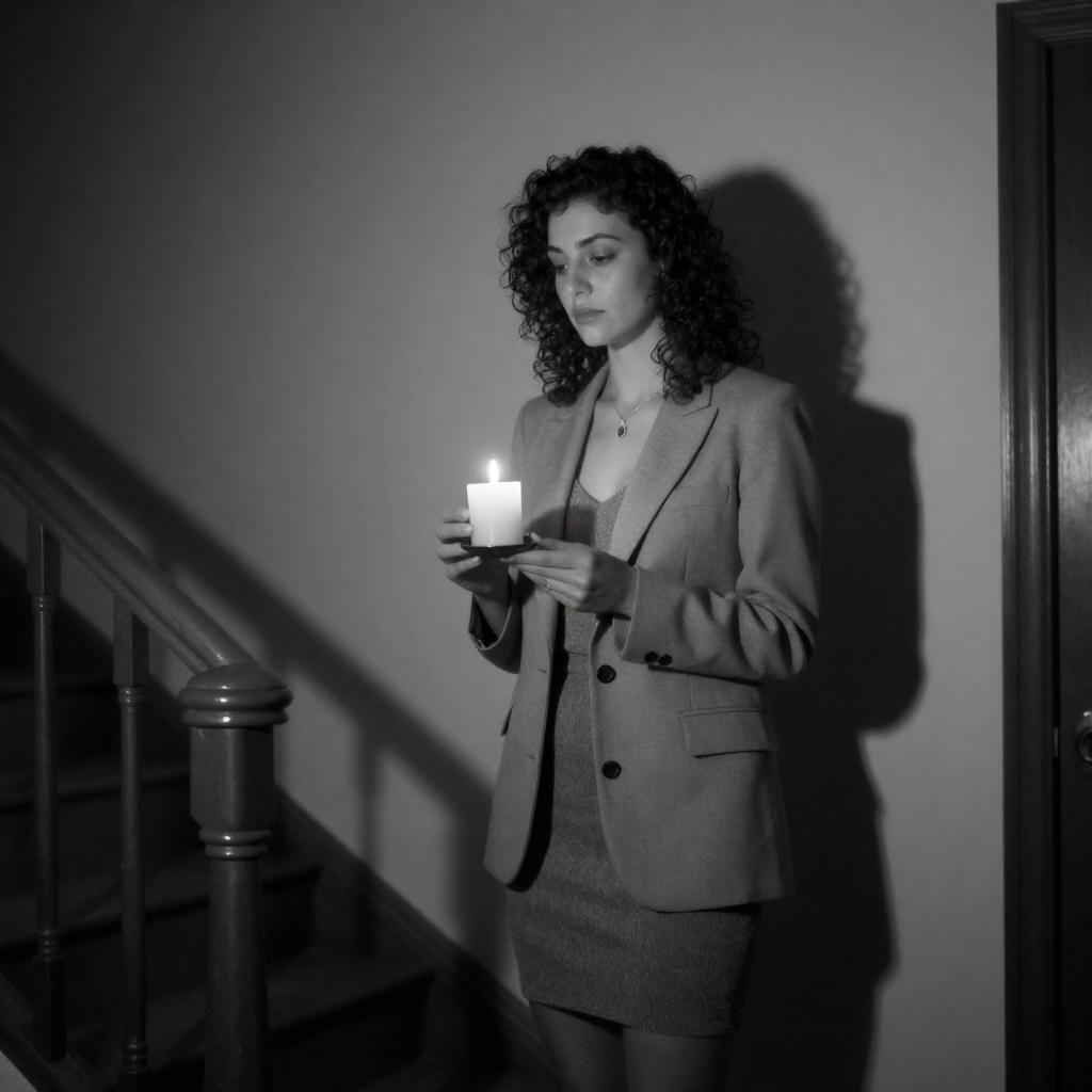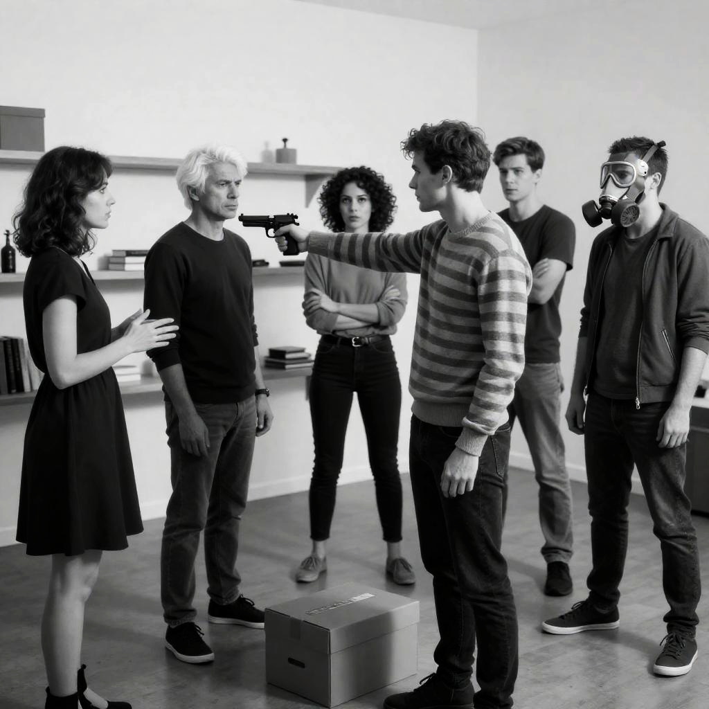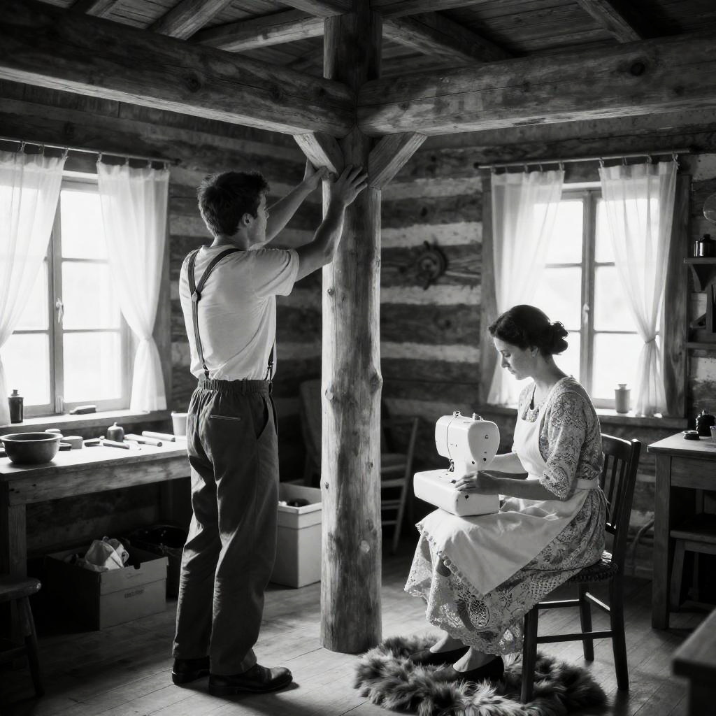 Black-and-white photograph of four people in a rustic room. A muscular man with curly hair stands, lifting something. A woman with long hair bends over a table. An older man with a bald head sits, facing left. A woman in a dress walks through an arched doorway. Rough stone walls, archway, and dim lighting. Shadows cast across the scene.