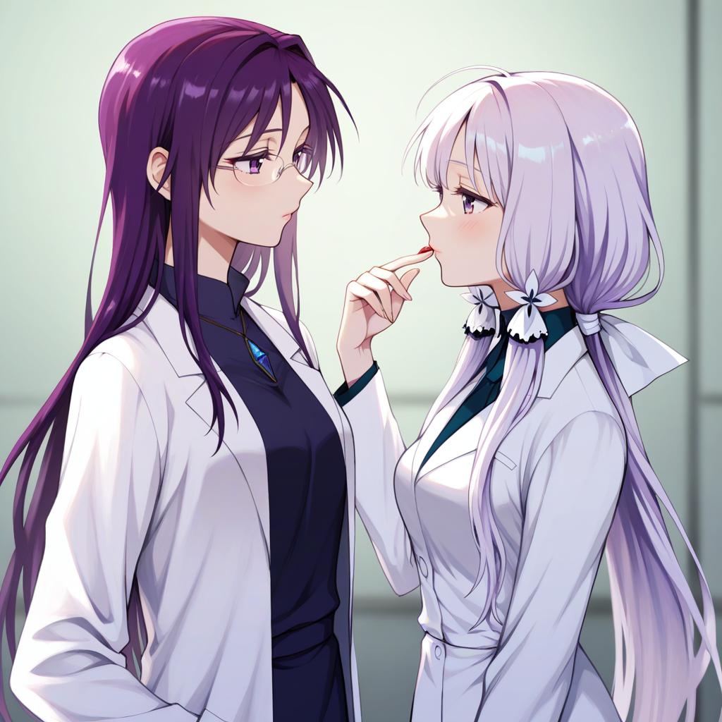 Asakura rikako, touhou, 1girl, purple eyes, glasses, purple hair, long hair, very long hair, hair ribbon, lab coat, long sleeves, by artist tsu (lovesick1964), illustrious